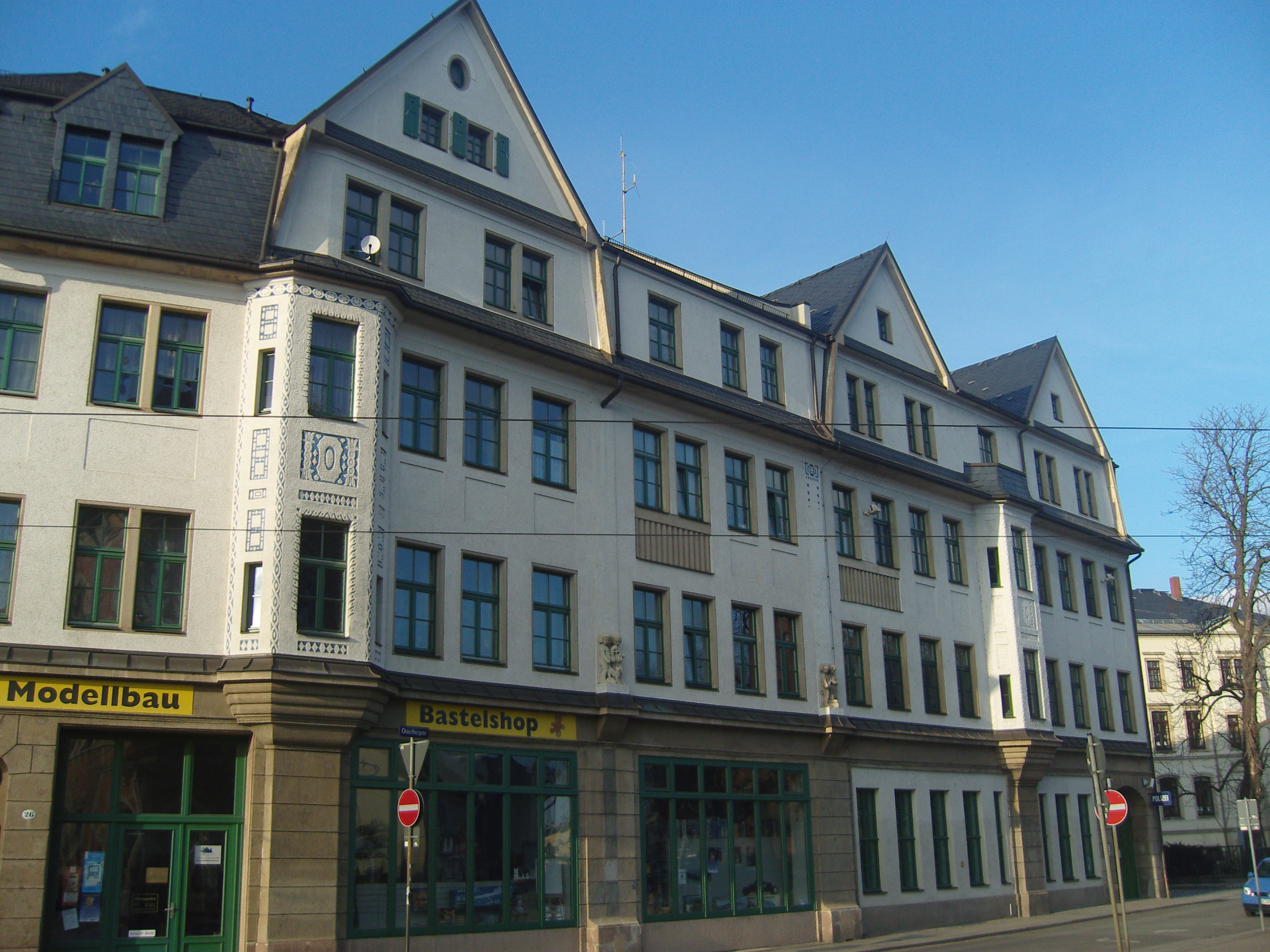 Deutsch: Denkmalgeschützte Gebäude in der Osterbergstraße 26 und 24; im Gebäude befindet sich die Polizeiwache Pieschen; aufgenommen von der Bürgerstraße aus |