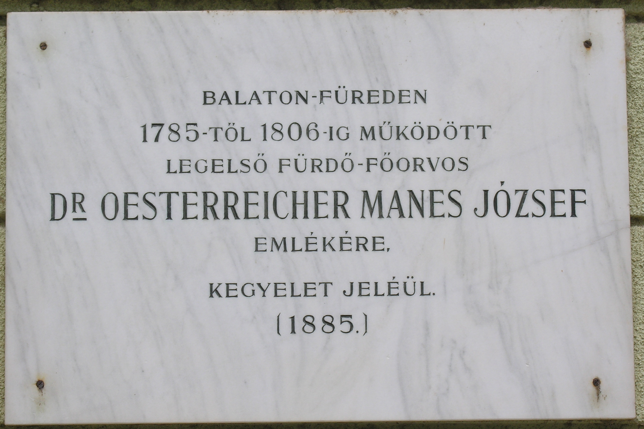(مجرية) English: Commemorative plaque of József Österreicher Manes in Balatonfüred, Gyógy Square No 2 |