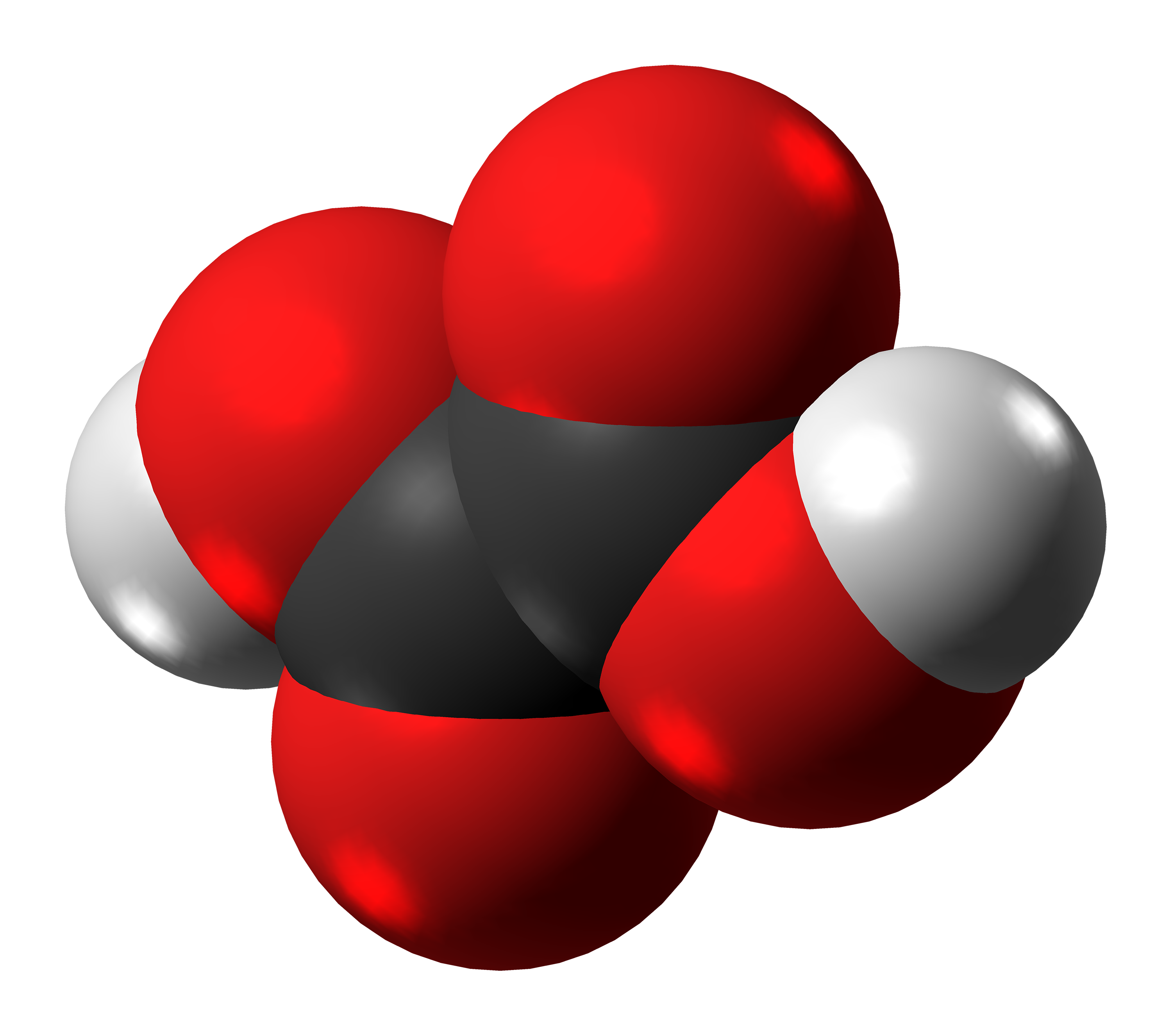 Space-filling model of the oxalic acid molecule, the simplest dicarboxylic acid.