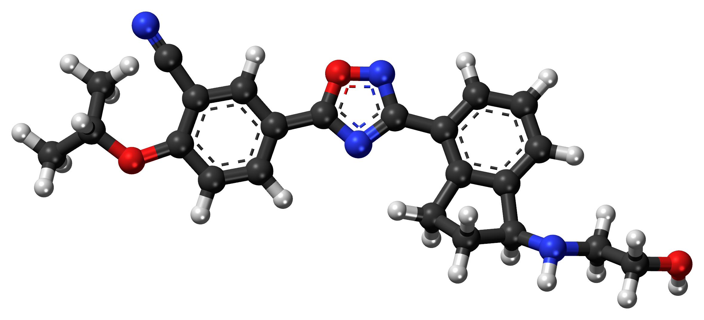 English: Ball-and-stick model of ozanimod—a sphingosine-1-phosphate receptor 1 modulator investigated as a medication for of multiple sclerosis and ulcerative colitis. Created using Accelrys DS Visualizer 4.1 and Adobe Photoshop CC 2015.