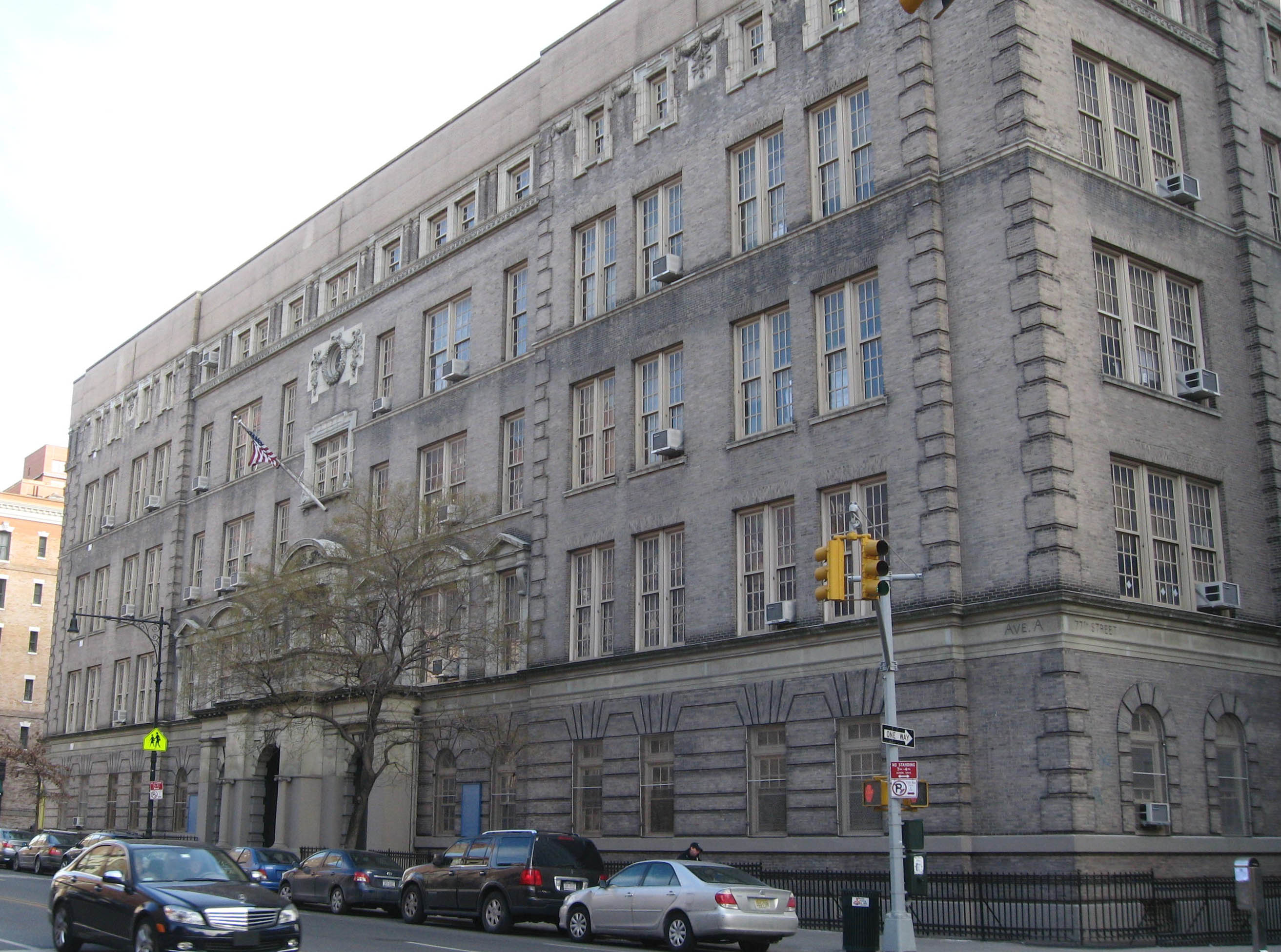 English: Looking northeast across en:York Avenue and 77th Street at en:P.S. 158, the en:Bayard Taylor School, on a partly cloudy midday. |
