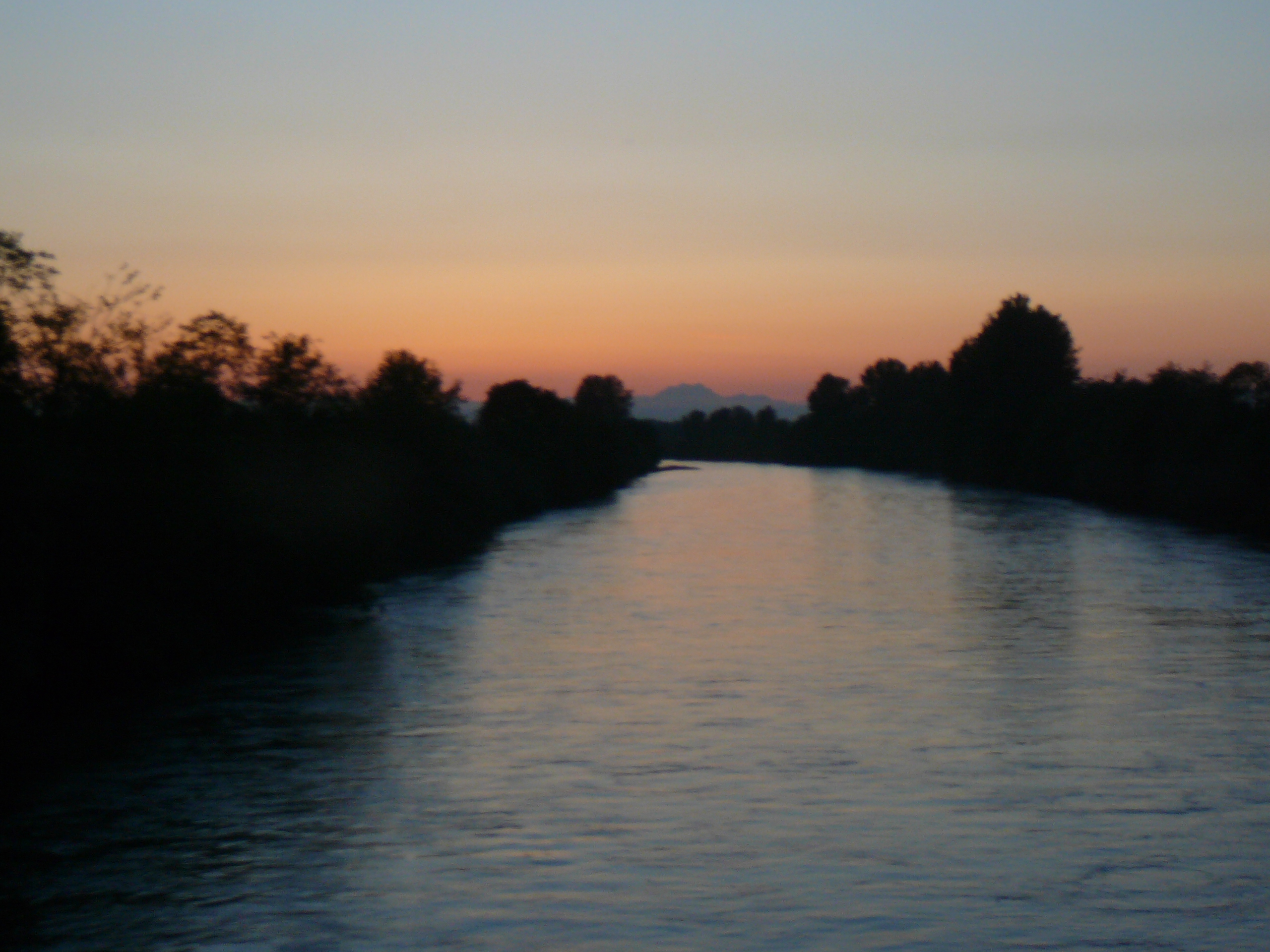 English: Puyallup River, looking northwest from the George Milroy Bridge at 66th Avenue East <-- location verified with Google Maps street view, guided by The Brothers peak aligned with the river; there is nowhere else this could have been taken, and the tree silhouettes still match in 2017 --> |