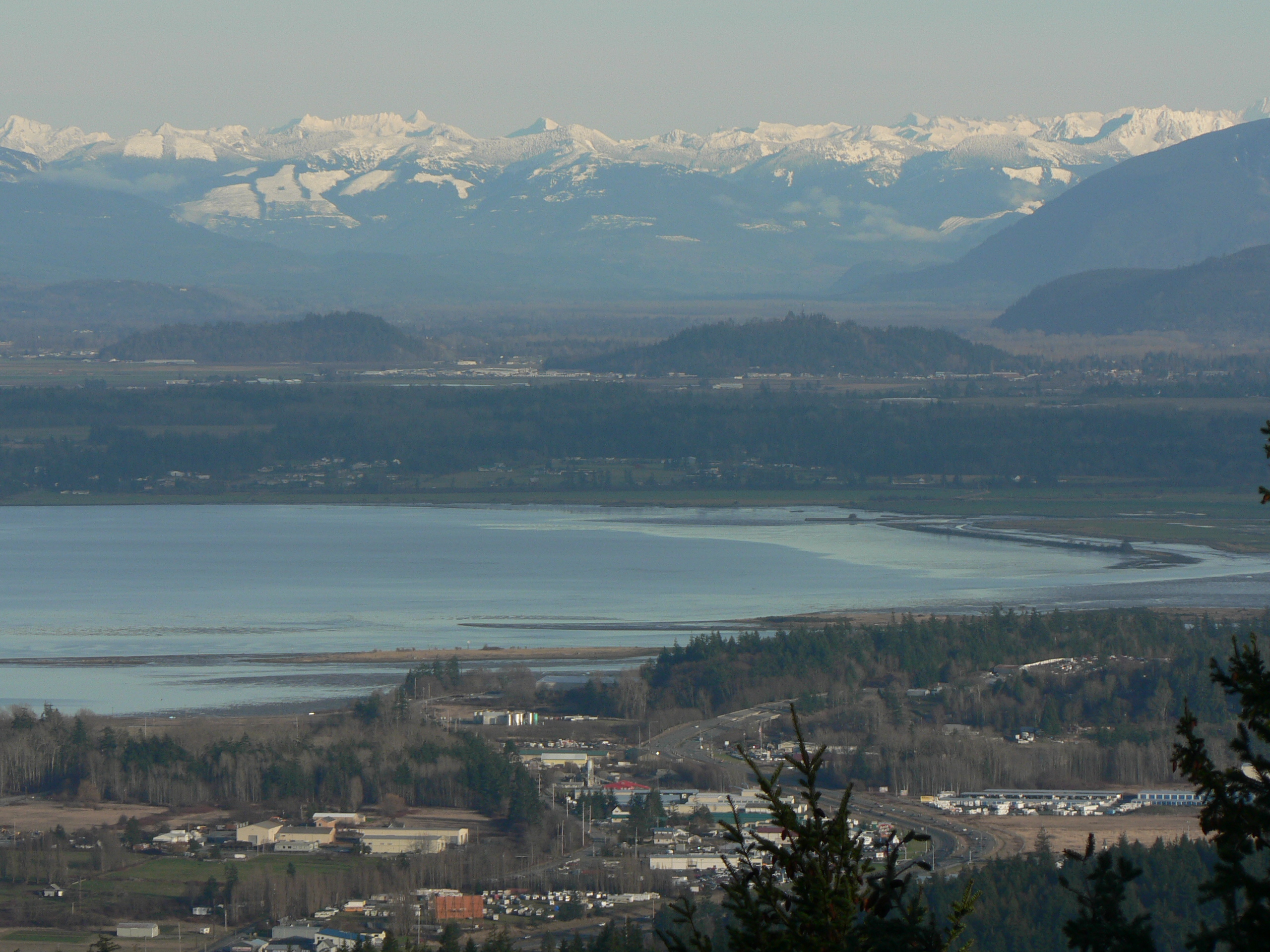 English: Padilla Bay and March Point (foreground); Skagit River Valley and North Cascade Range (beyond) |