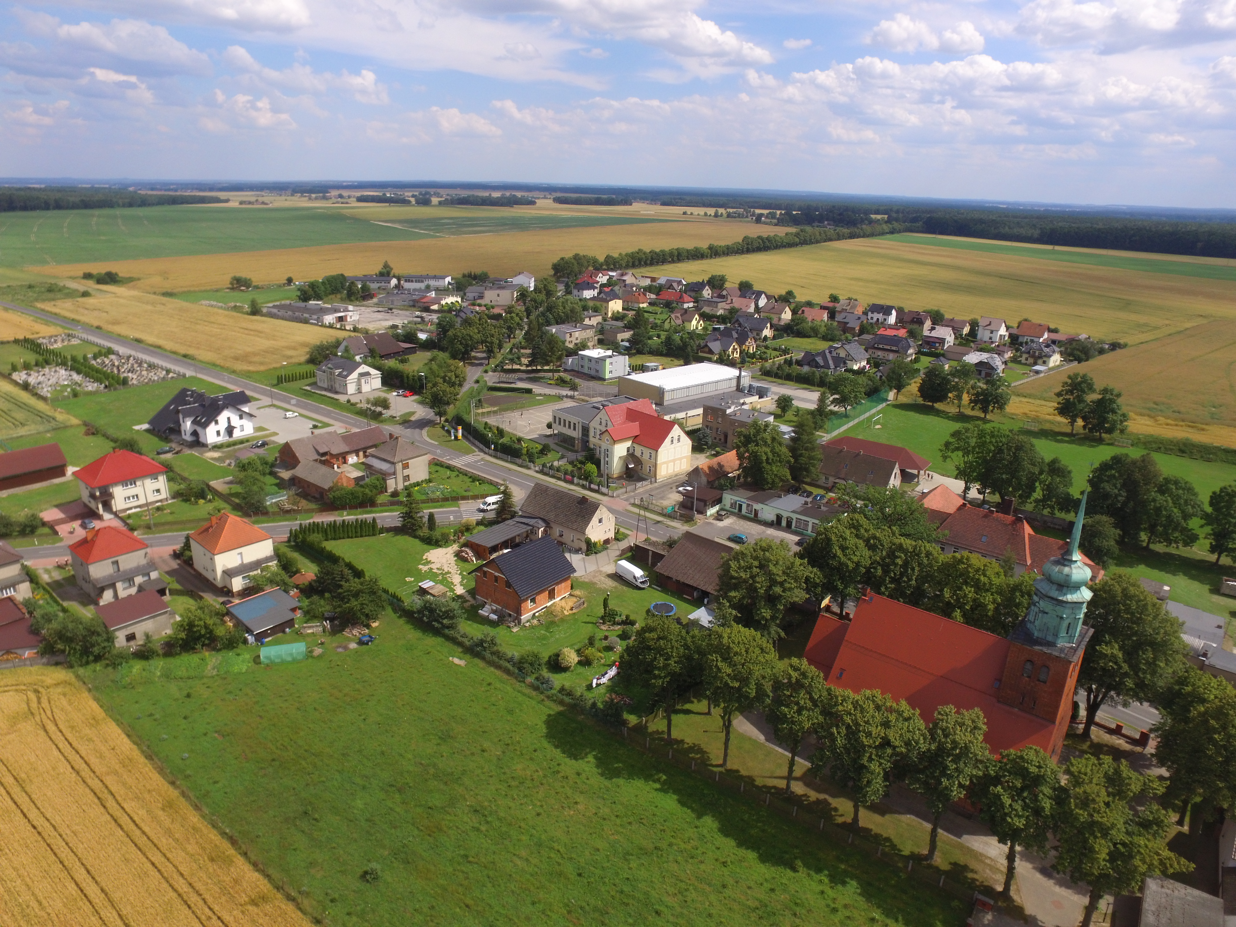 | Description | Widok na centrum wsi Radłów, na pierwszym planie widoczny kościół pw. Najświętszego Serca Pana Jezusa oraz Urzędu Gminy, Gminnego Ośrodka Kultury. |