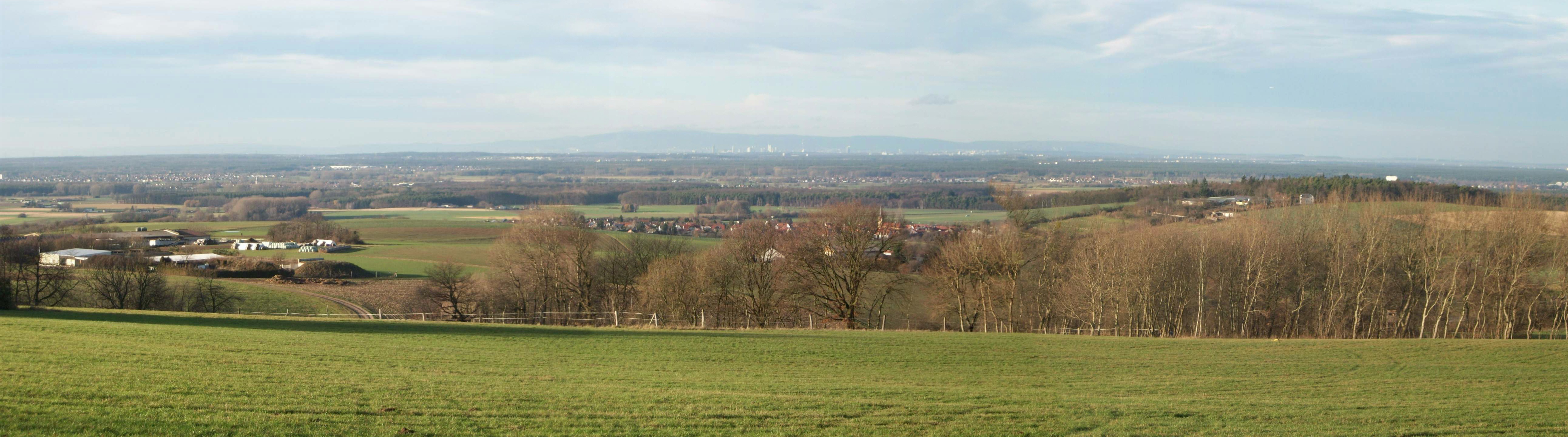 Deutsch: Blick vom Standort Binselberg Klein-Umstadt, den letzten Ausläufern des nördlichen Odenwaldes (Naturraum Kleine Bergstraße (231.3) nach Norden und Westen in die Dieburger Bucht (Naturraum 232.230), Teil der Untermainebene (Rhein-Main-Tiefland). Am Horizont Frankfurt am Main und der Taunus |