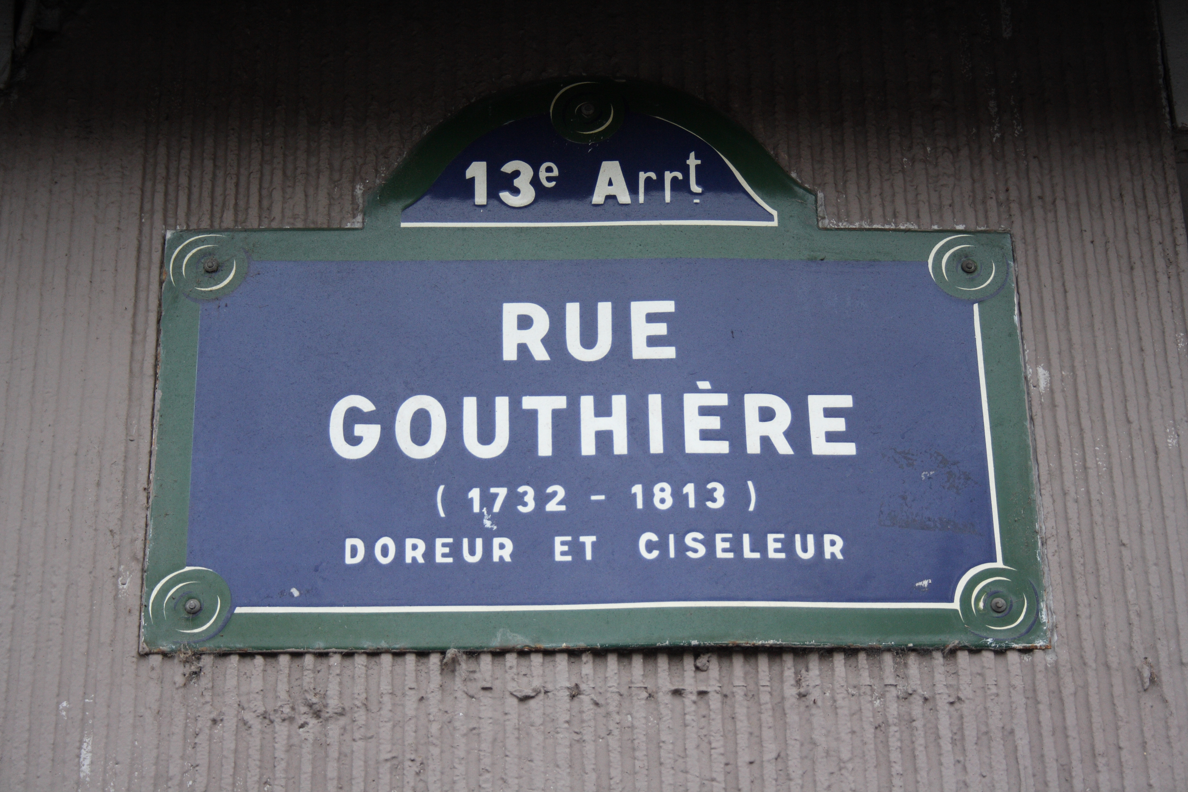 Deutsch: Straßenschild Rue Gouthière in Paris (13. Arrondissement) |
