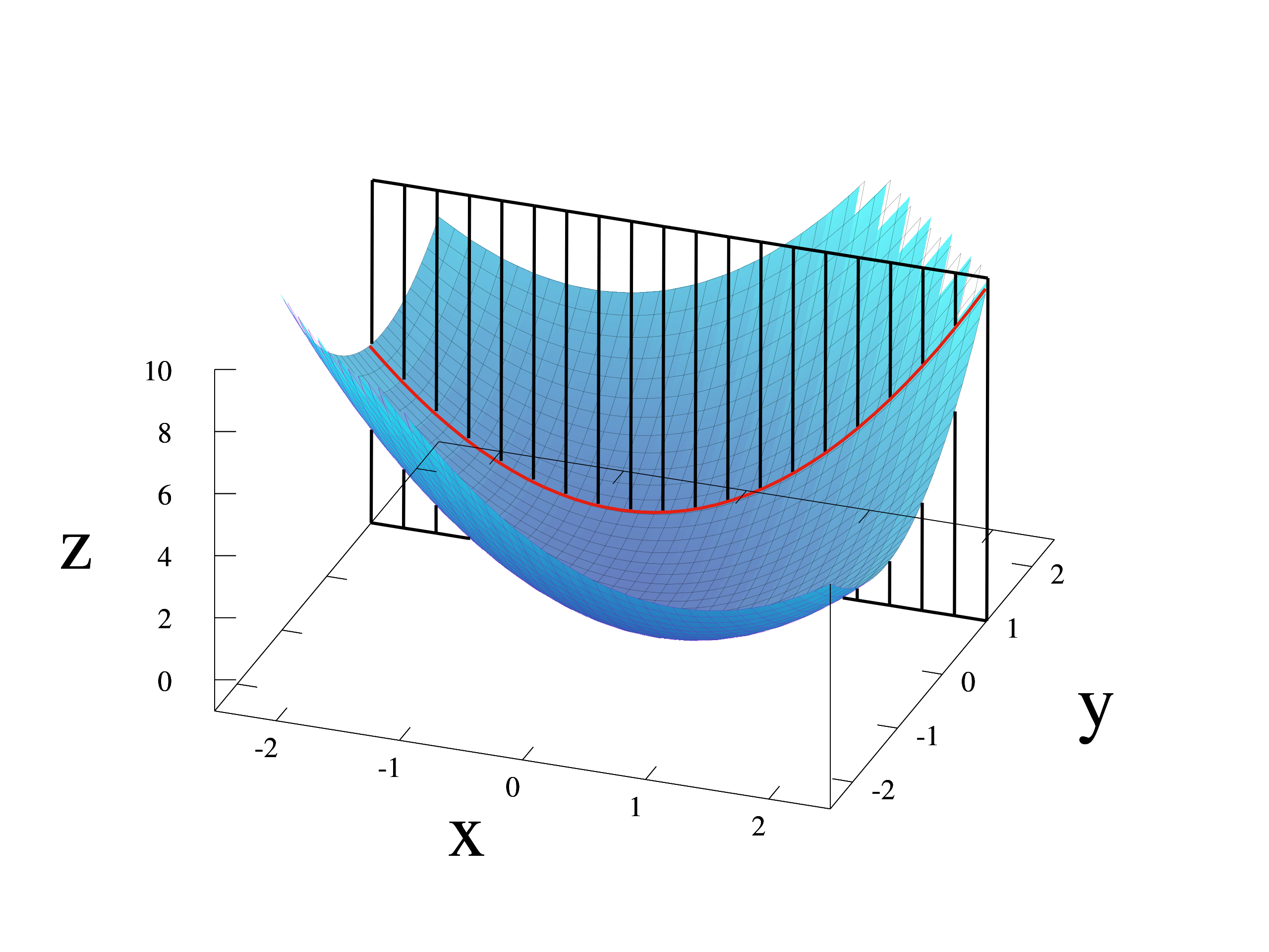 # Draw the surfaces of f(x,y) = x^2 + xy + y^2 and y=1.