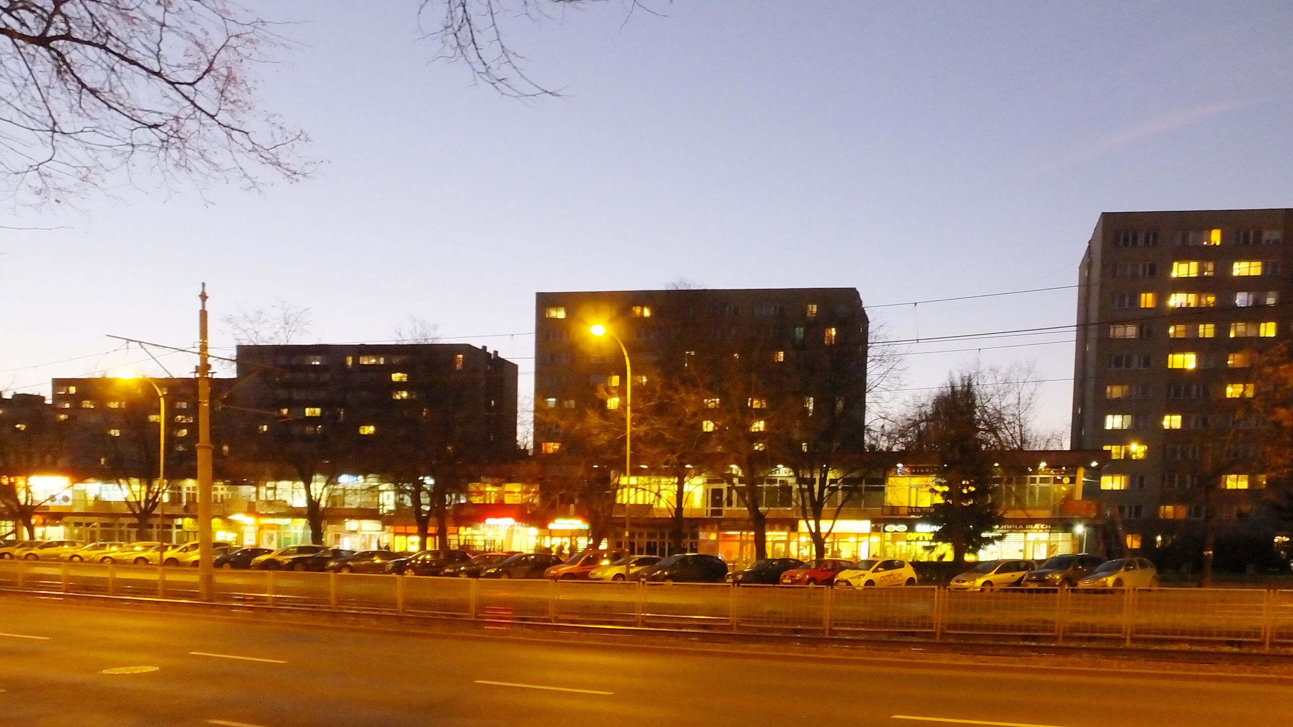 Polski: Wieczór w Warszawie. Pawilony przy ulicy Grójeckiej 128 i bloki przy ulicy Geodetów |