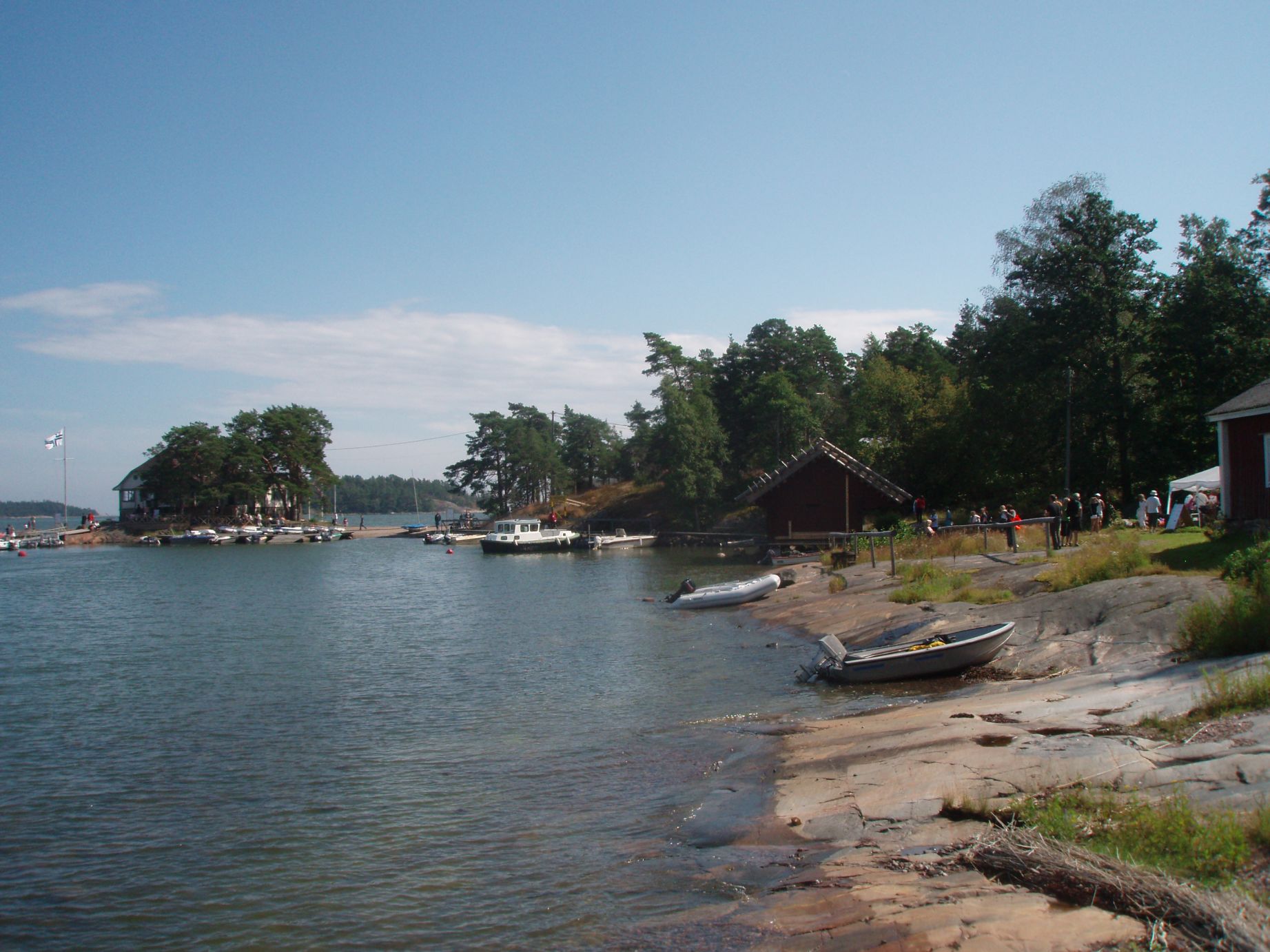English: Buildings in the island Pentala in Espoo. To the left the yacht club Esbo segelförening and to the right different old fishing huts