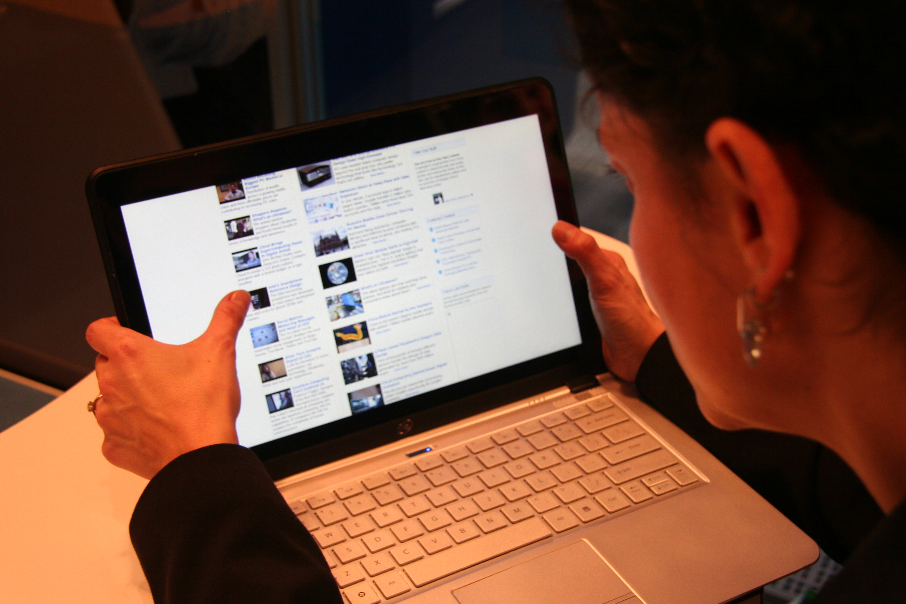 English: In her testing, Intel user experience manager Daria Loi observed people using their thumbs to touch both sides of the screen, similar to how people hold a tablet or smartphone. But Loi says that participants strongly expressed that they did not want the keyboard to go away. “Many gave practical or emotional reasons for liking the physical keyboard, such as the way it feels or sounds when pressing down on the different keys," she said. "Most participants did not like interacting with the virtual keyboard, even when touch was their favorite input modality.”
