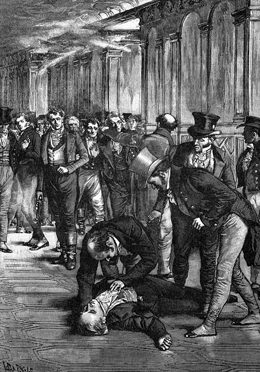 English: A Print of the shooting of the prime minister, Spencer Perceval, in the House of Commons, 11 May 1812