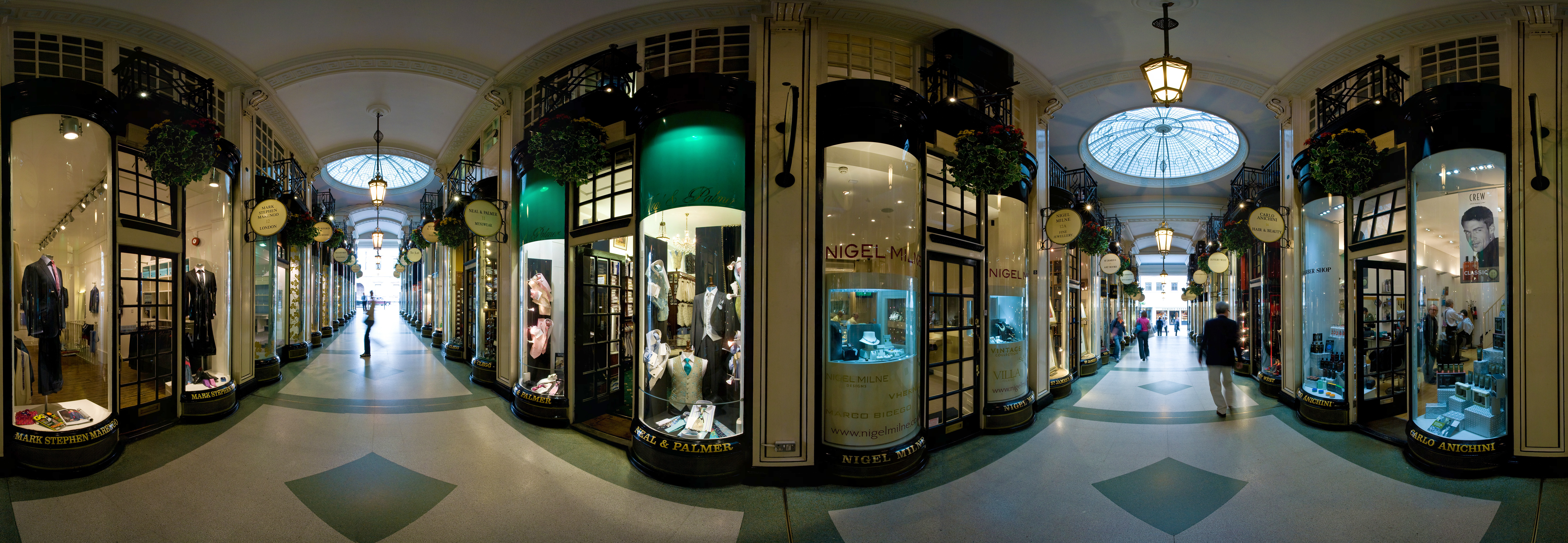 English: A 360 degree view of the inside of Piccadilly Arcade in London. Taken by myself with a Canon 5D and 17-40mm f/4L lens. |