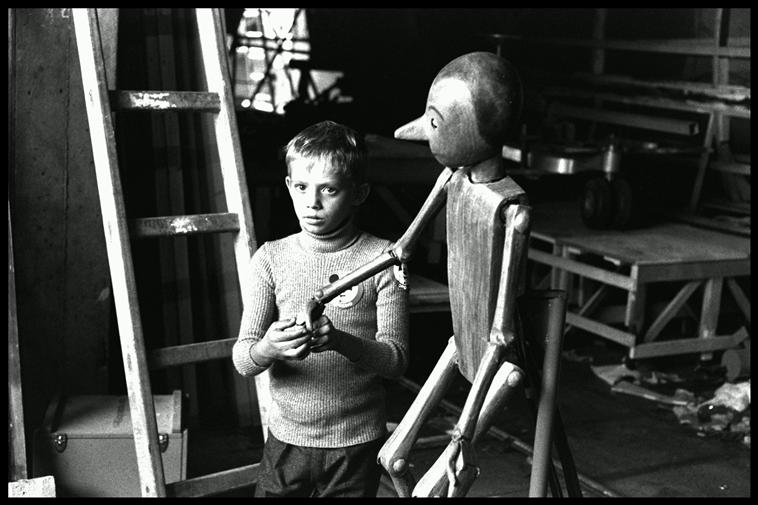 Français : Sur le plateau de tournage d'un film, un très jeune garçon tient la main d'une marionette de bois (Pinnochio), regard caméra, l'air inquiet. RAI TV. |