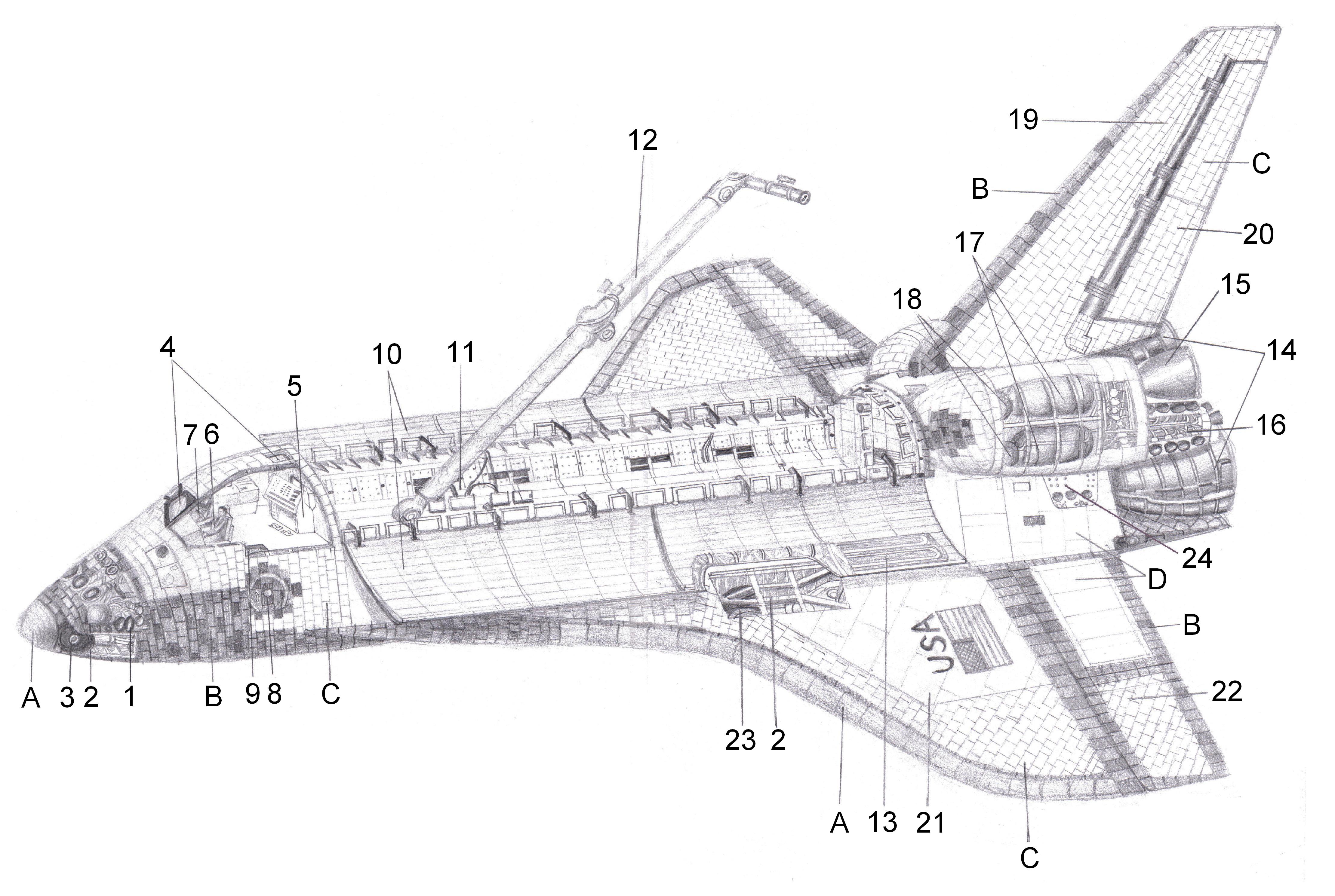English: A labelled diagram showing the components of a Space Shuttle Orbiter.