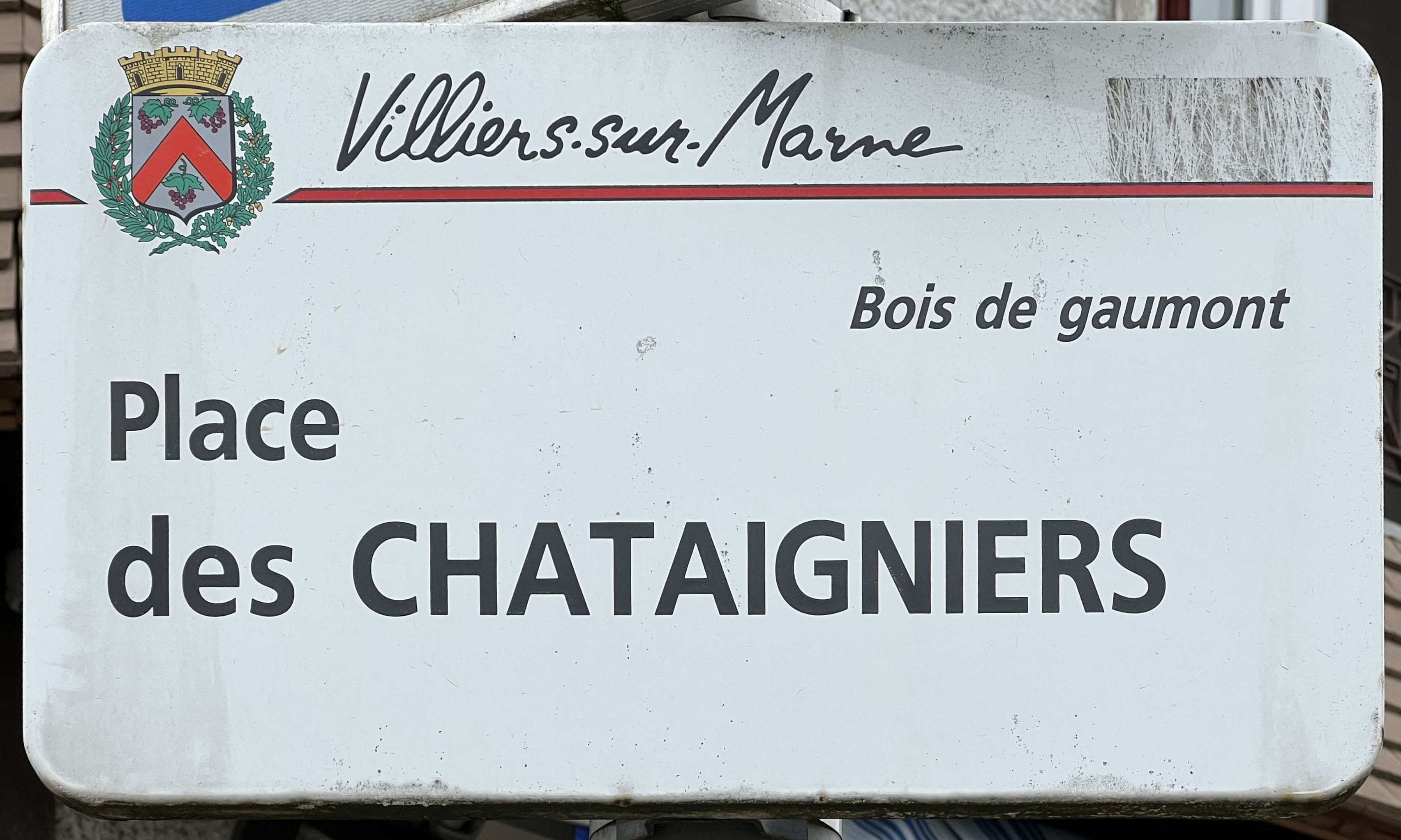 Français : Plaque de la place des Châtaigniers, Villiers-sur-Marne. |