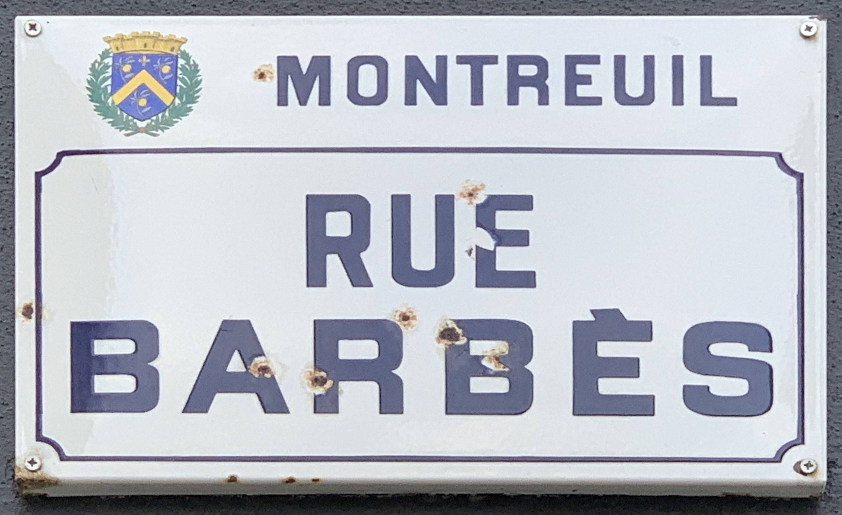 Français : Plaque de la rue Barbès, Montreuil, Seine-Saint-Denis. |