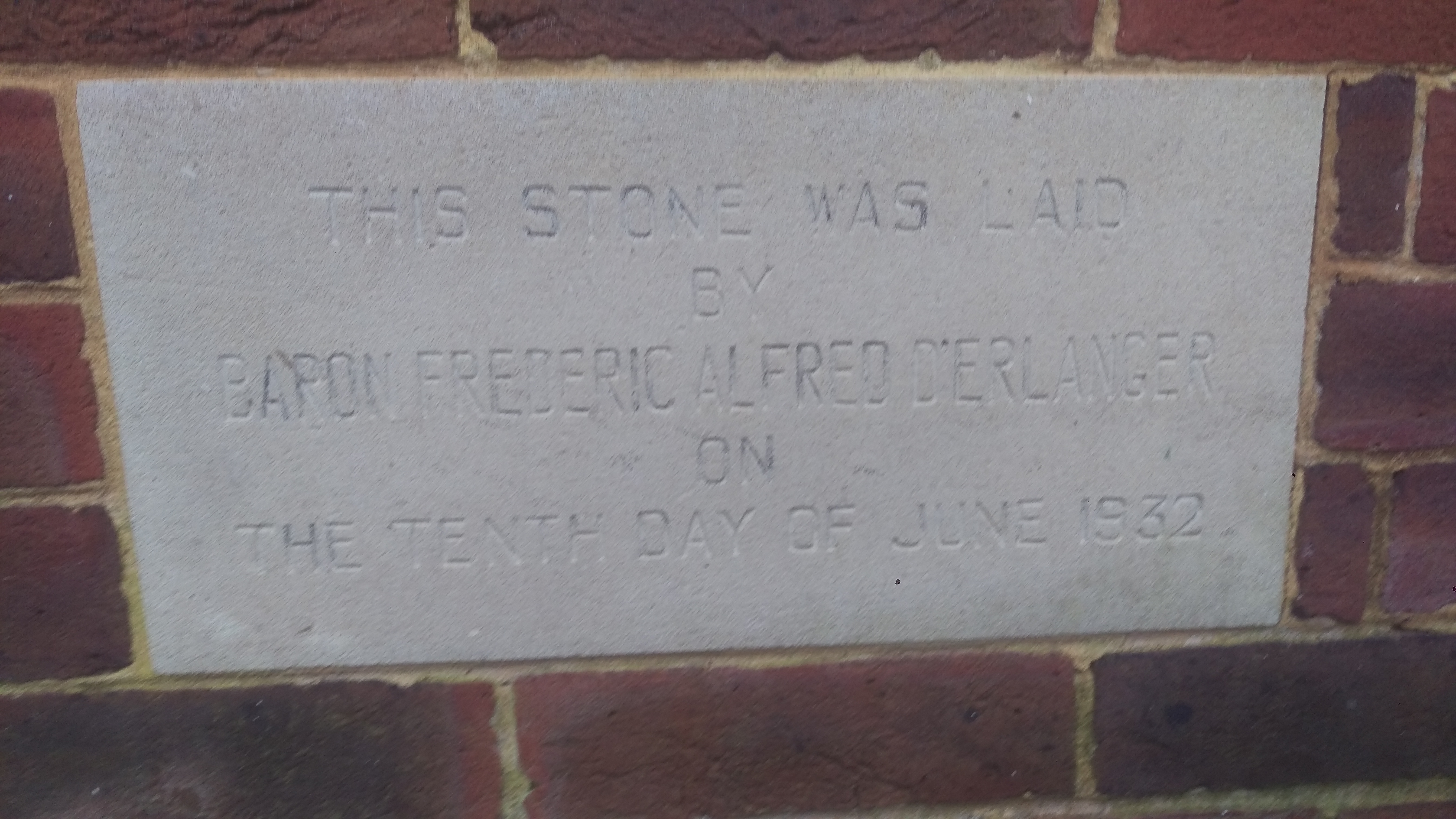 English: Plaque on Merebank House, near Dorking, to say that Baron Frédéric Alfred D'Erlanger, the composer of the opera Tess and other operatic, musical and ballet works, founder of the Oxford and Cambridge Musical Society, laid this stone (the 5 bedroom detached house was built for the retired members of the musicians union, not him, and showed on a local postcard as the musicians pension fund convalescent home, Holmwood; Baron D'Erlanger laid the foundation stone, was present at its opening, and a performance of his opera Tess later took place in the garden, attended also by Sir Henry Wood). |