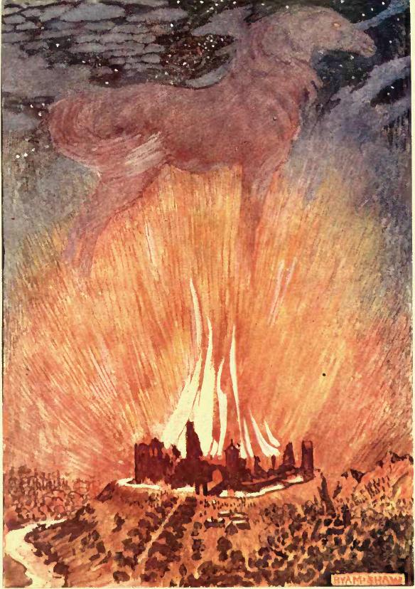 English: Byam Shaw's illustration for Poe's Metzengerstein in "Selected Tales of Mystery" (London : Sidgwick & Jackson, 1909) on the page to face p. 174 with caption "A cloud of smoke settled heavily over the battlements in the distinct collosal figure of - a horse" |