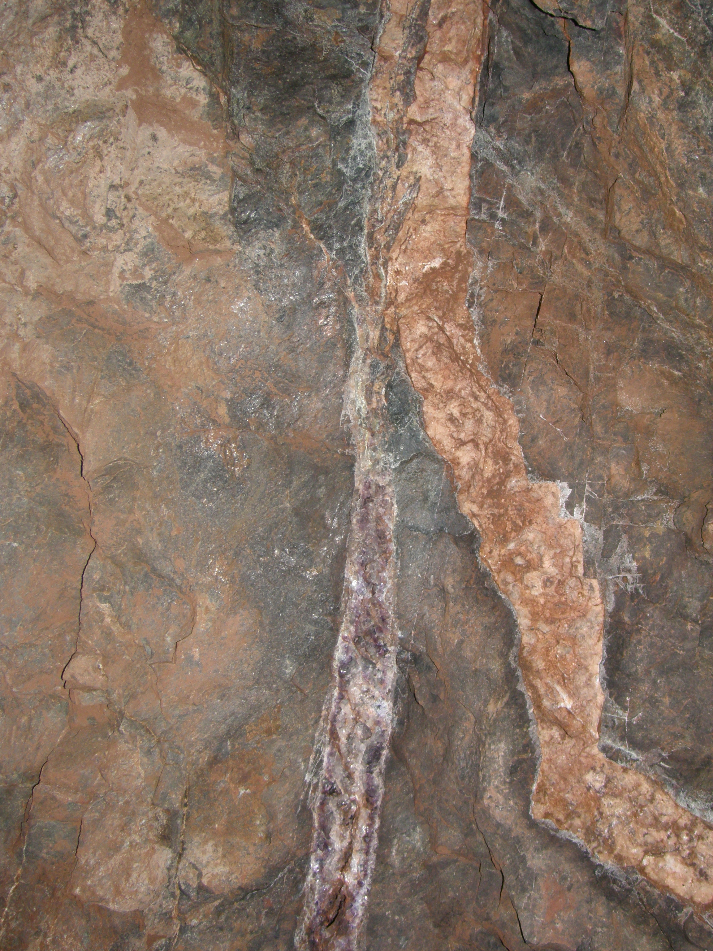 English: Two different types of veins at the Poehla-Haemmerlein deposit, Germany: a "kku" vein (about 270 Ma to 280 Ma old) with quartz and violet fluorit on the left and a "mgu" vein (about 150 Ma to 180 Ma old) with dolomite and goethite on the right; host rock is a skarn. These vein types of veins are the major carriers of uranium deposits of the Erzgebirge.