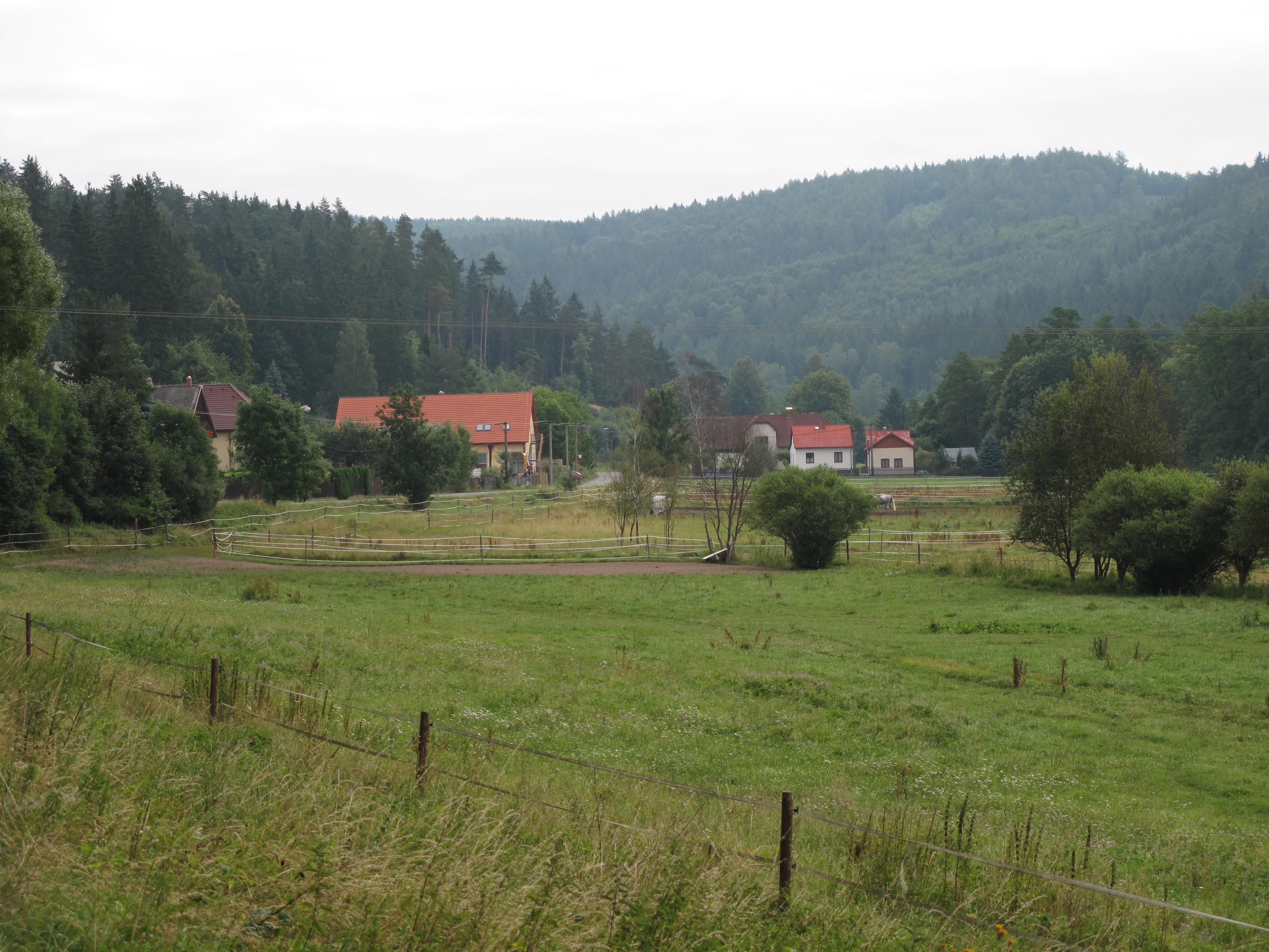 (بالتشيكية) English: View at Pyskočely village with horse run, Prague-East District, Czech Republic.