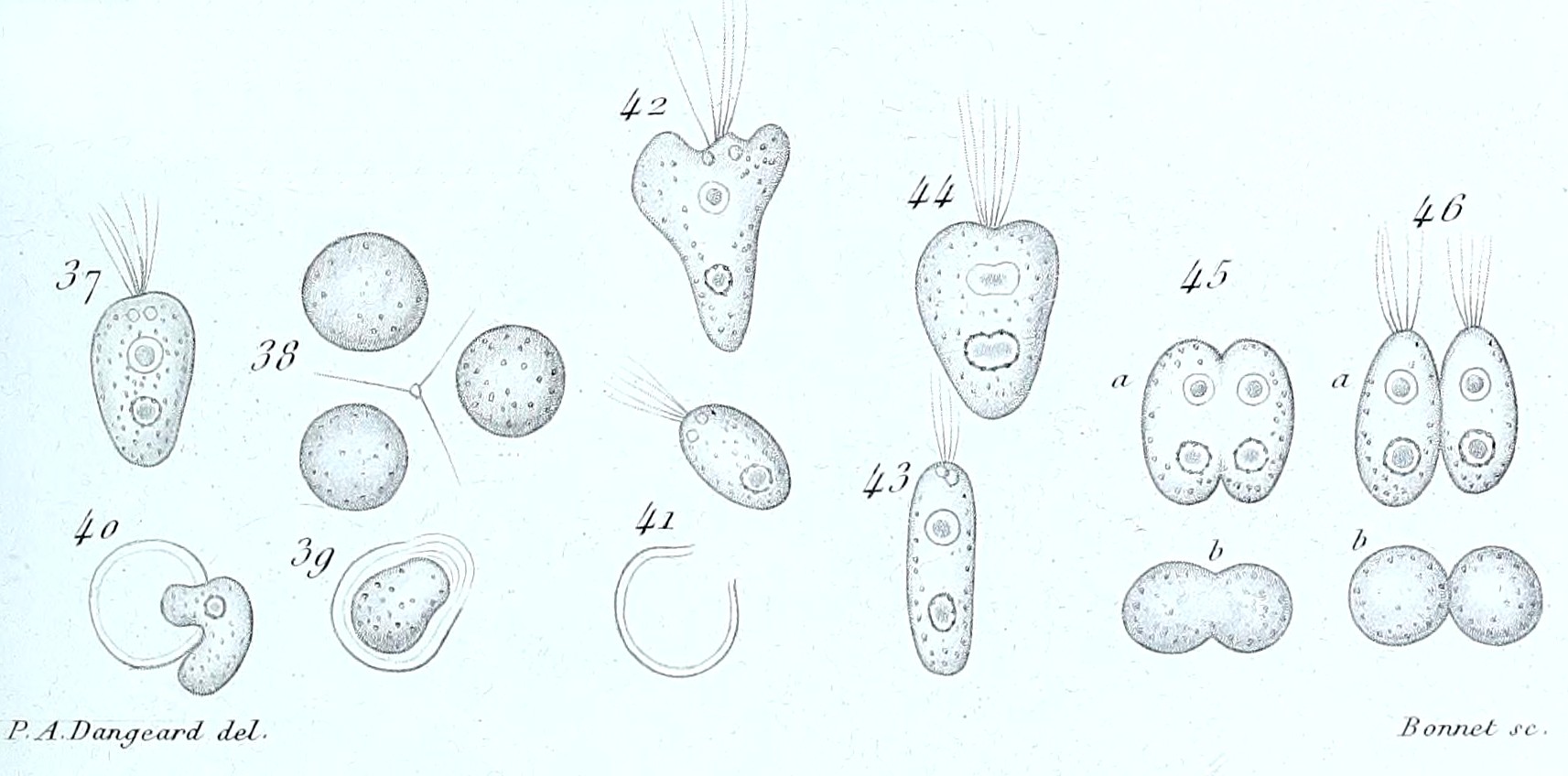 From: Dangeard, P.-A. 1888. Recherches sur les algues inférieures. Annales des Sciences Naturelles, Botanique, série 7 7: 105–175. plate 11: figs 37–46 (cropped) |