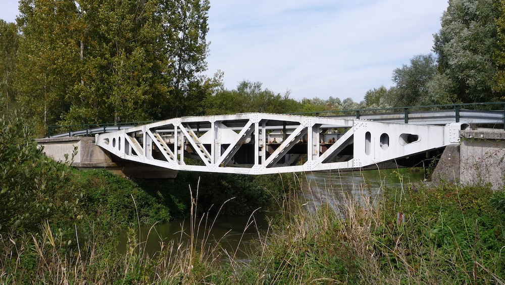Français : Le pont sur l'Oise à Manicamp. Son armature est une des pièces utilisées en Normandie par les alliés en juin 1944 pour construire les ports artificiels dans le but de débarquer du matériel. Cette pièce a été apportée en 1947.