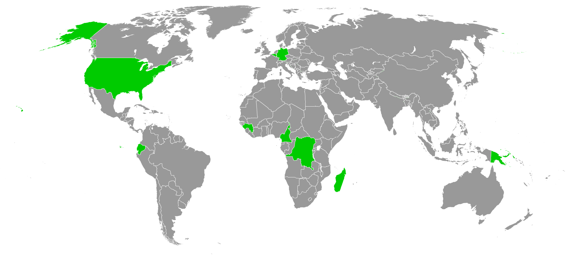 Rank values used: Bhutan 17 Ecuador 25 Cameroon 25 Madagascar 25 Papua New Guinea 25 Guinea 25 Congo, Democratic Republic of the 41 Germany 60 United States 61 |