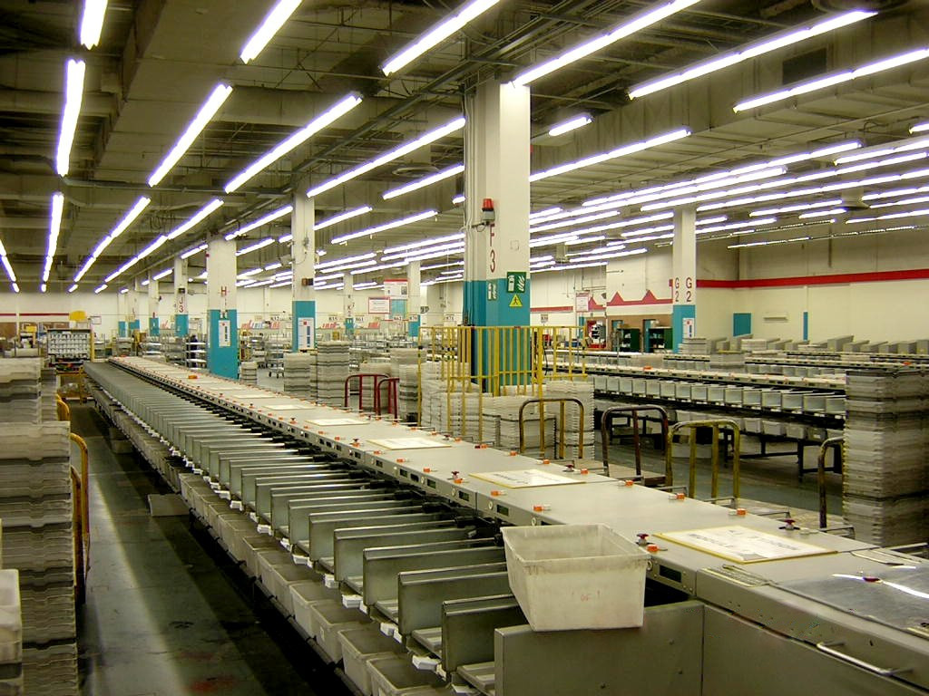English: Automatic sorters inside a major Canadian postal facility.