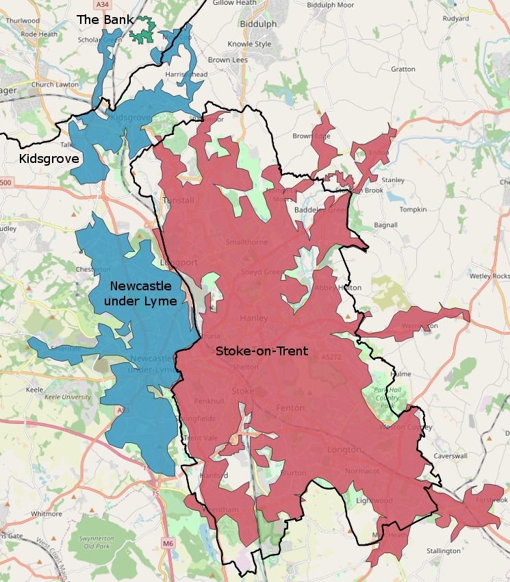 English: Map of the Stoke-on-Trent Built-up Area showing subdivisions and local authority boundaries |