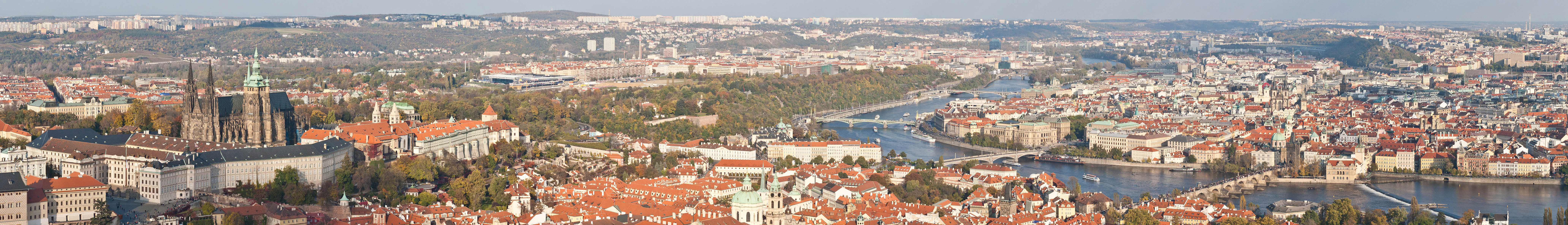 English: A panoramic view of Prague as viewed from Petřín Lookout Tower. The view is approximately 180 degrees, from north on the left to south on the right. |