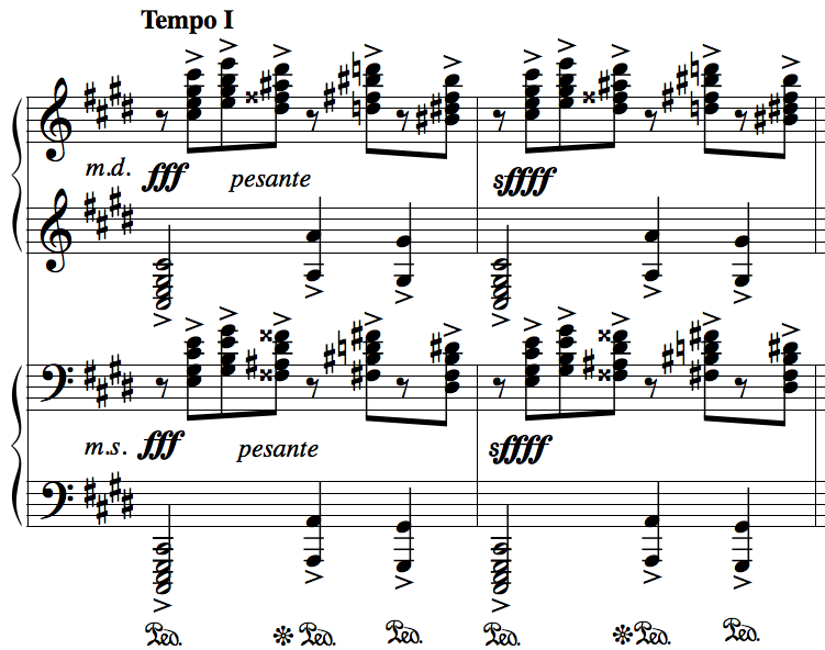 English: Rachmaninoff's Prelude in C-sharp minor, Op. 3, No. 2; the recapitulation of the theme, in four staves |