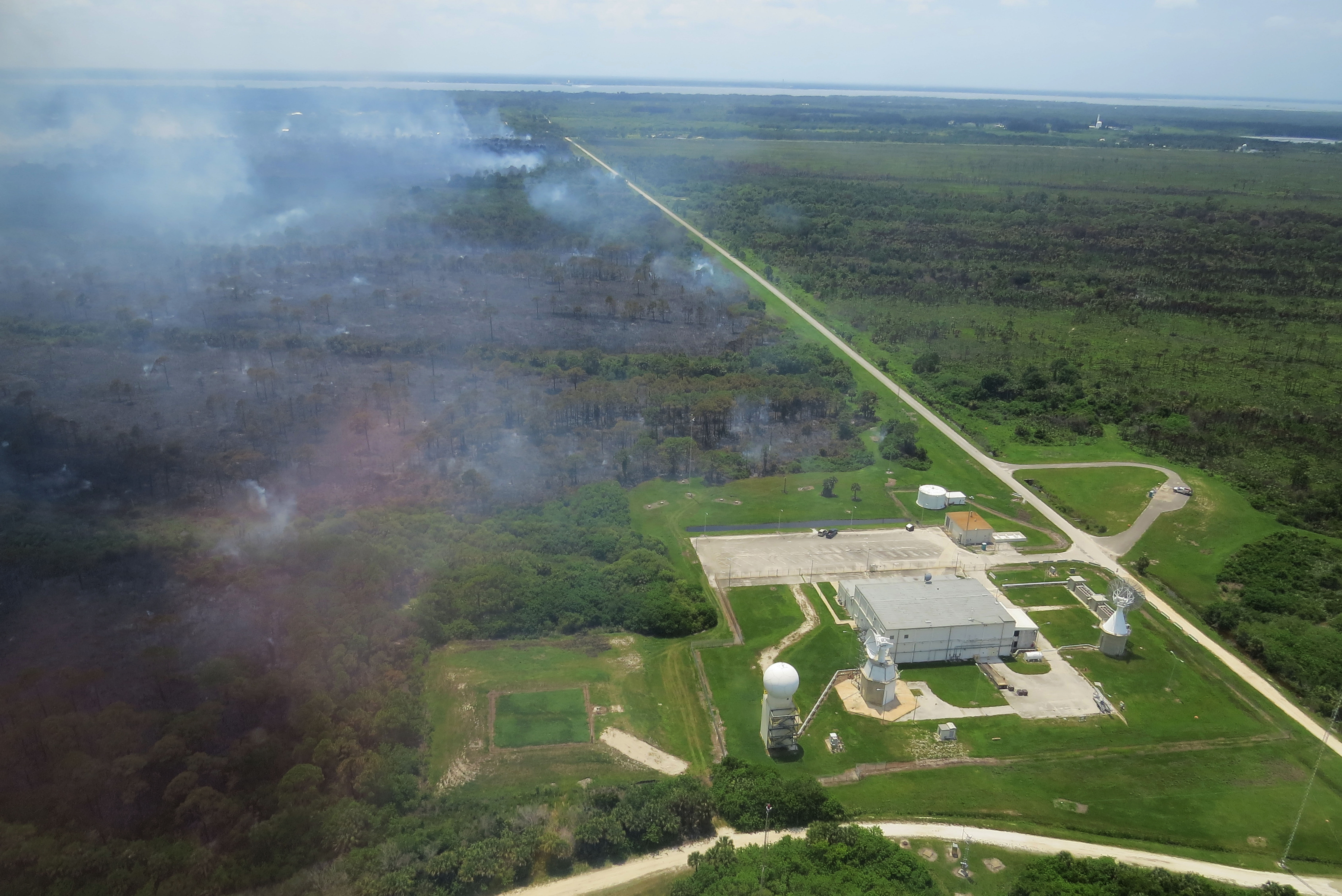 English: A prescribed fire on Merritt Island NWR south of the Kennedy Space Center Visitor Complex on June 14th, 2013. Prescribed fires reduce the threat of wildfires to these neighborhoods and the NASA infrastructure while improving wildlife habitat. The USFWS works with NASA to ensure that the habitat around Kennedy Space Center is in good condition for all the visitors (human and animal) that come to the Space Coast. Photo: Michael Good - USFWS