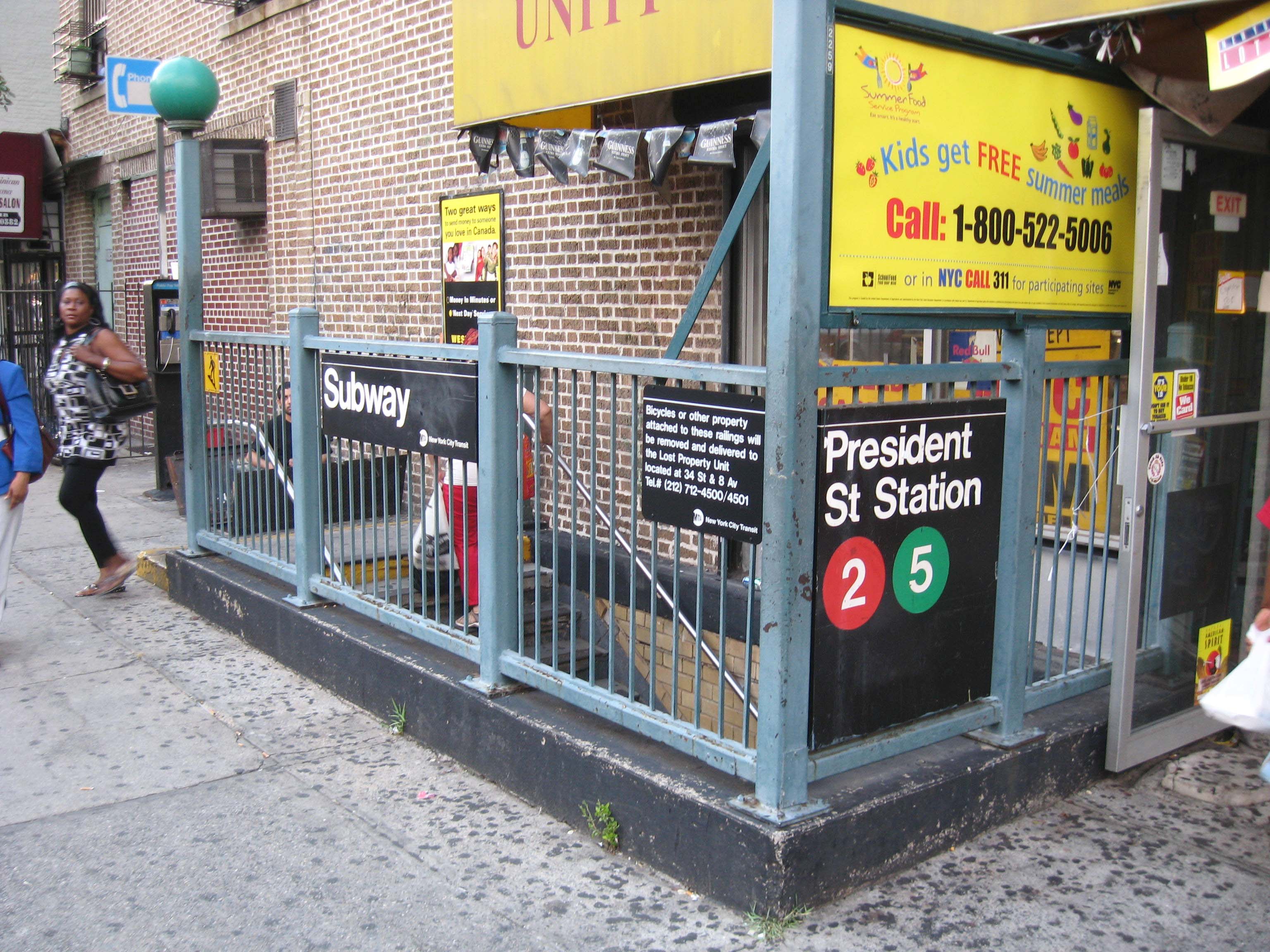 English: Looking northwest at western street stair of en:President Street (IRT Nostrand Avenue Line) on a sunny early evening |