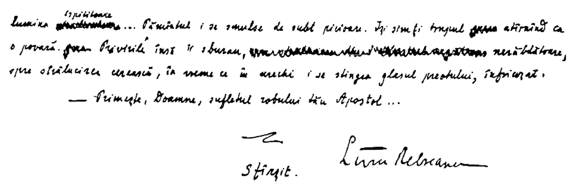 English: The closing lines of the novel Forest of the Hanged, by Romanian author Liviu Rebreanu: the protagonist, Apostol Bologa, at the gallows, where his confessor recites Primește, Doamne, sufletul robului tău Apostol… ("Receive, o Lord, the soul of Thy servant Apostol"). In Rebreanu's own handwriting, with signature. |