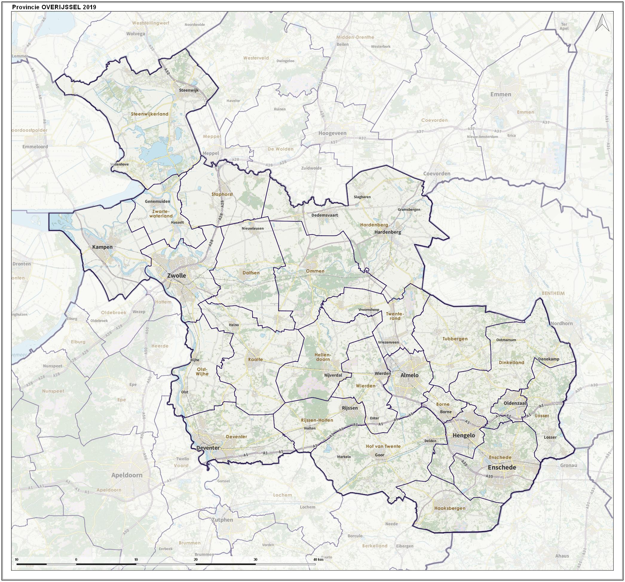 (Dutch) English: Overview map of the province, including municipal borders, largest places and major infrastructure. |