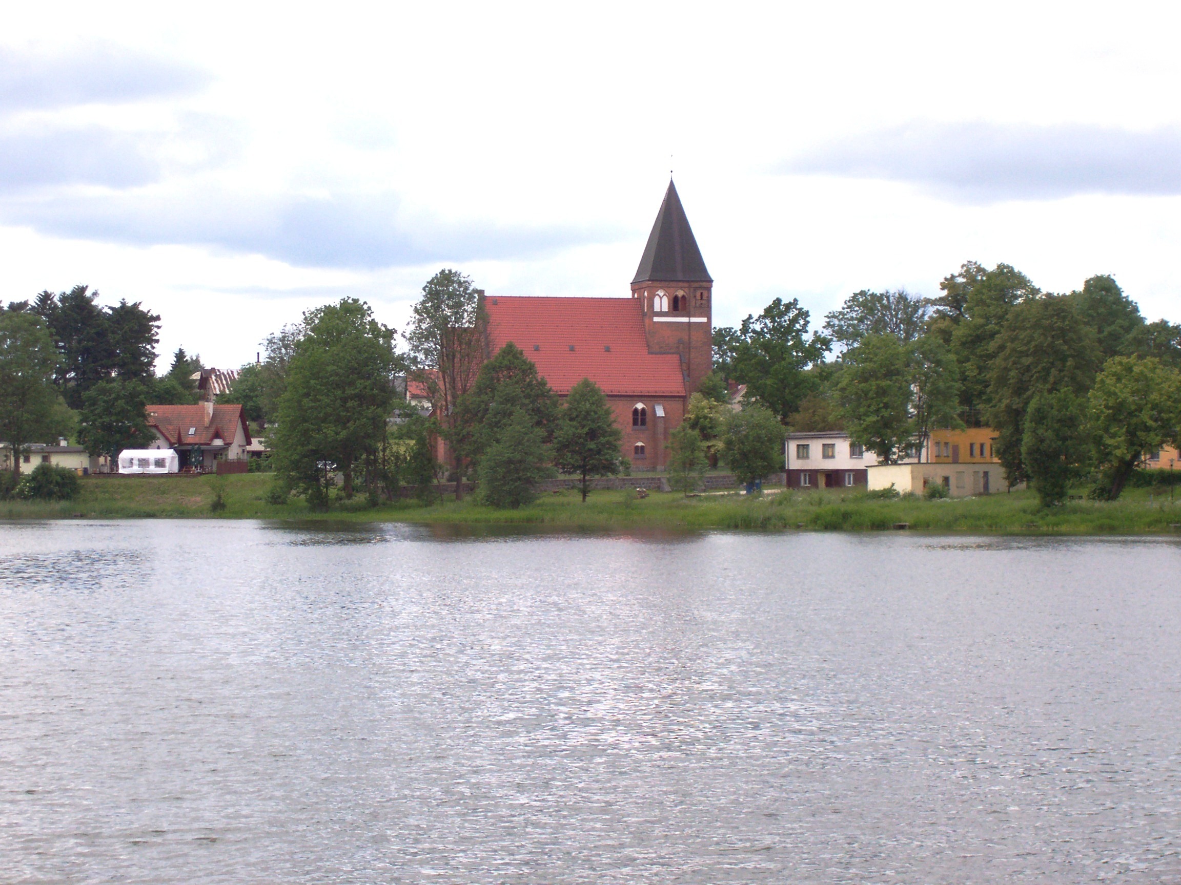 Polski: Kościół p.w. Matki Boskiej Różańcowej w Przywidzu i jezioro Przywidzkie Małe.