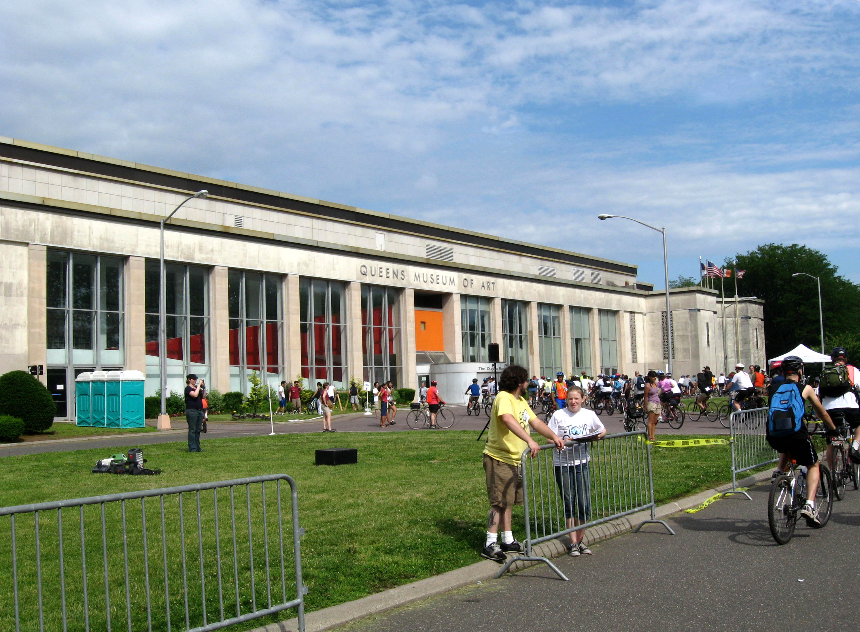 English: Looking northwest on a sunny morning at en:Queens Museum of Art as the first annual Tour de Queens prepares to roll. |
