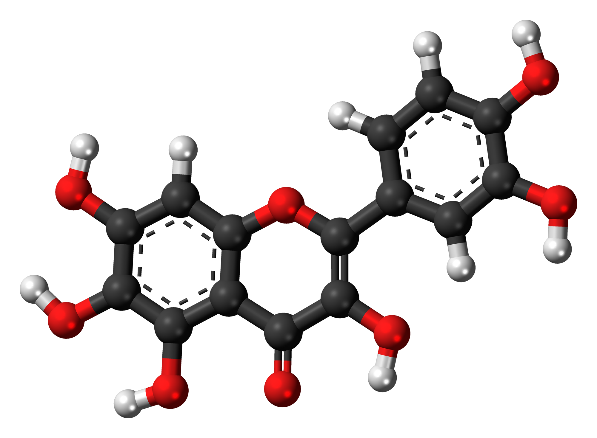 Ball-and-stick model of the quercetagetin molecule, a compound of the flavonols family. Colour code: