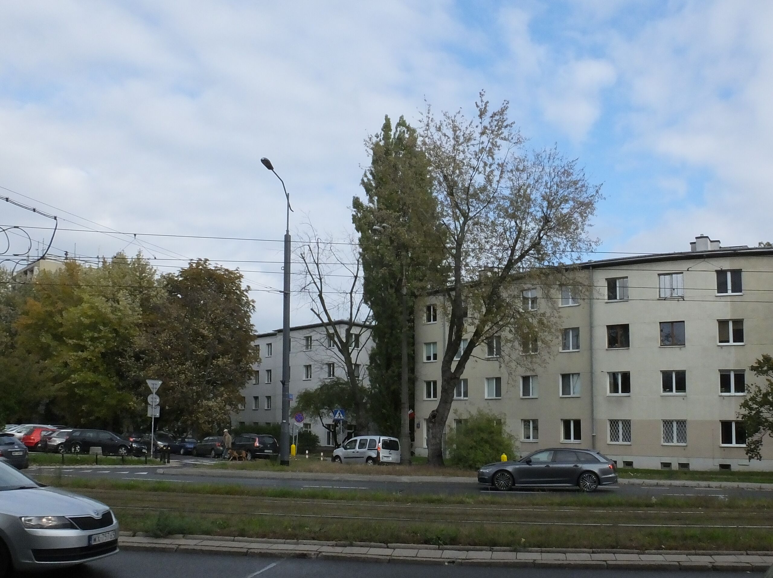 Polski: Osiedle WSM Żoliborz Centralny. Bloki pod adresem ks. J. Popiełuszki 14 (Kolonia XII –budynek 1 i 2), róg ul. H. Czaki. |