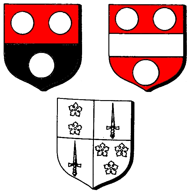 b) Gules, a fess argent, between three plates c) Two cinquefoils pierced; quartering, 2 and 3, a sword in pale, point towards chief; 4, three cinquefoils |