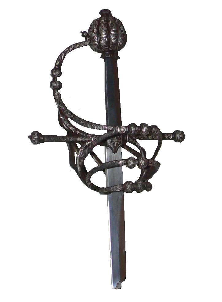 English: Silver damascened rapier guard, between 1580 and 1600. Fake blade.