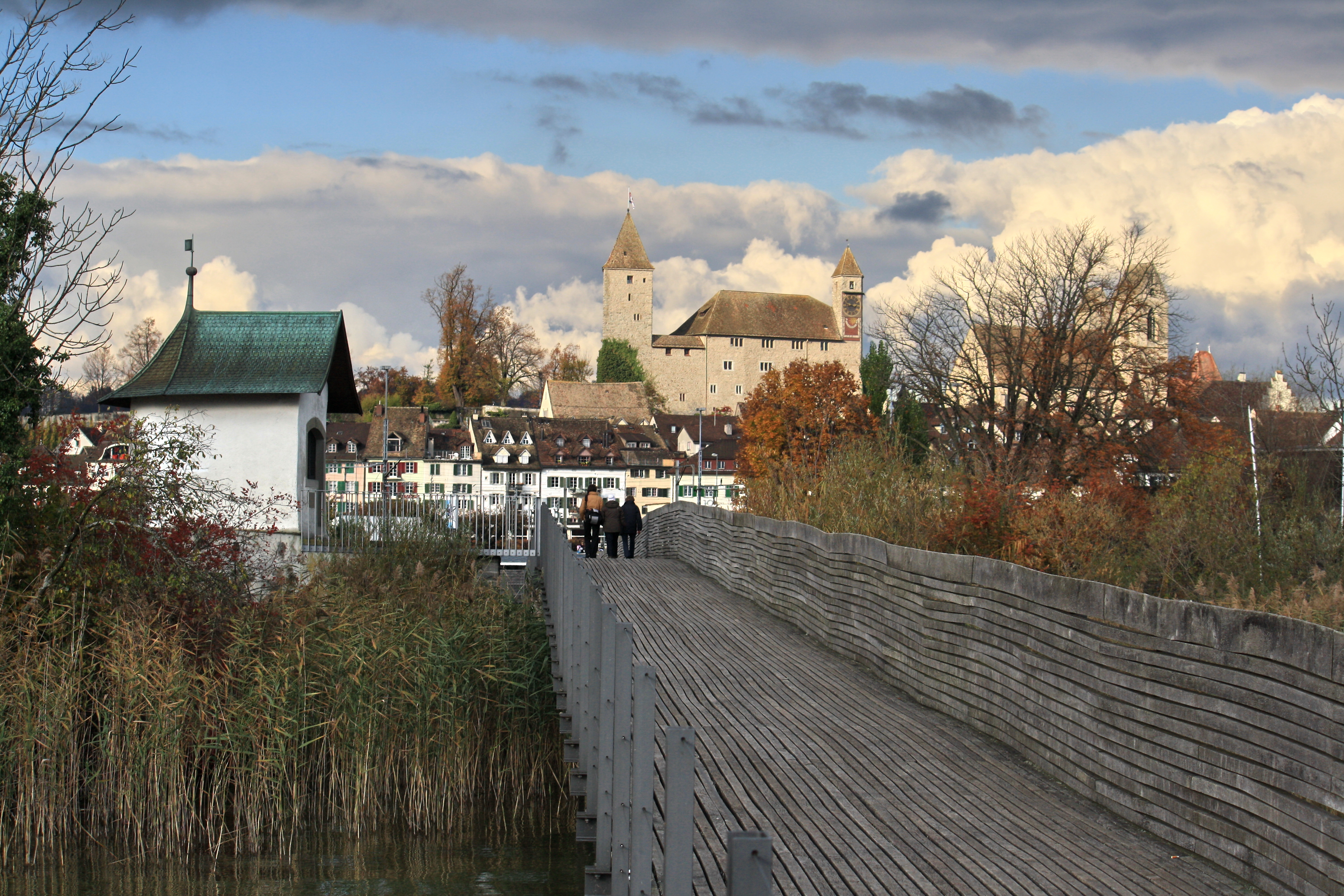 Deutsch: Rapperswil (SG) : Holzbrücke Rapperswil-Hurden (oberer Zürichsee), links die Pilgerkapelle «Heilig Hüsli», im Hintergrund Schloss, Altstadt und Stadtkirche (ganz rechts).