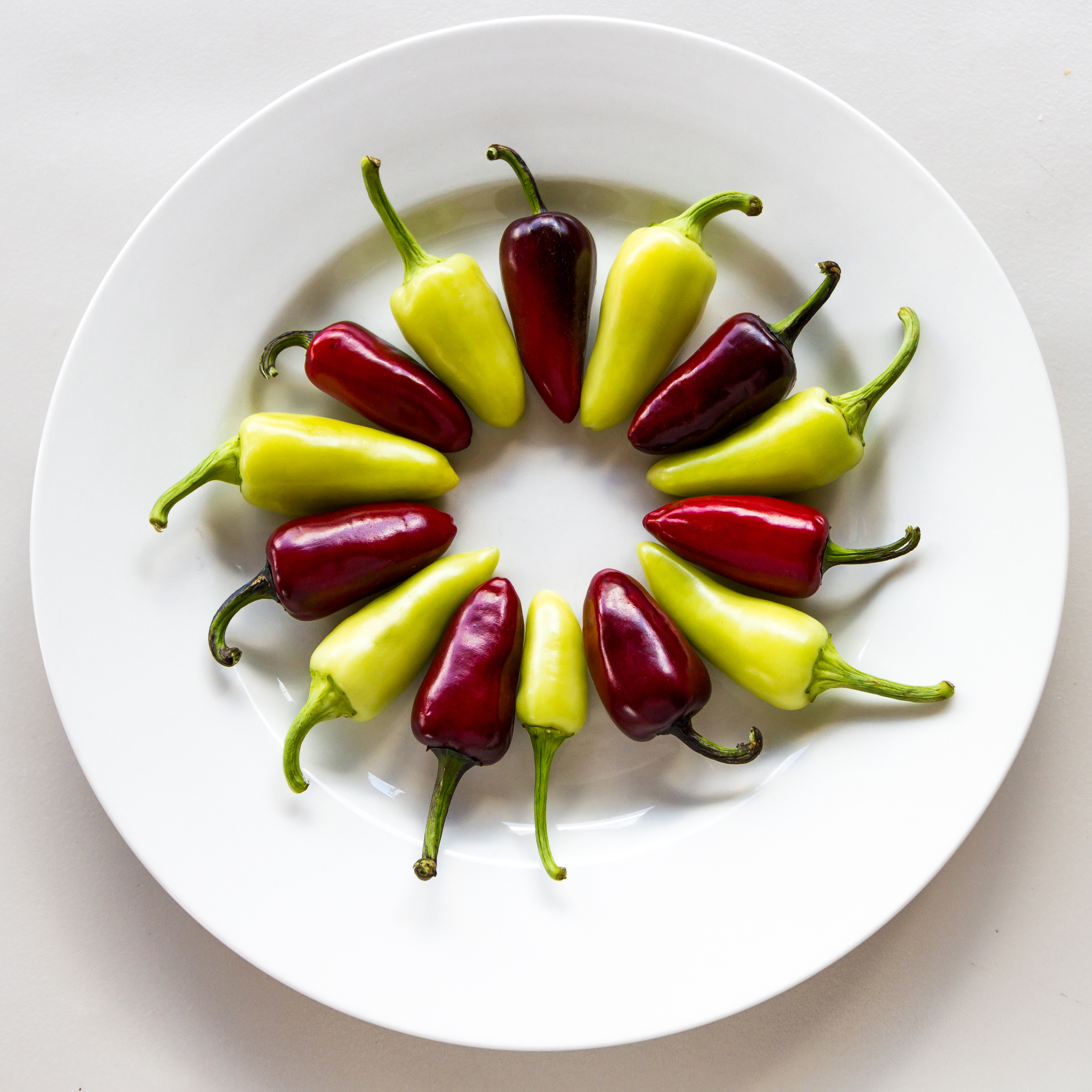 English: Red and green peppers on a white place with white background |