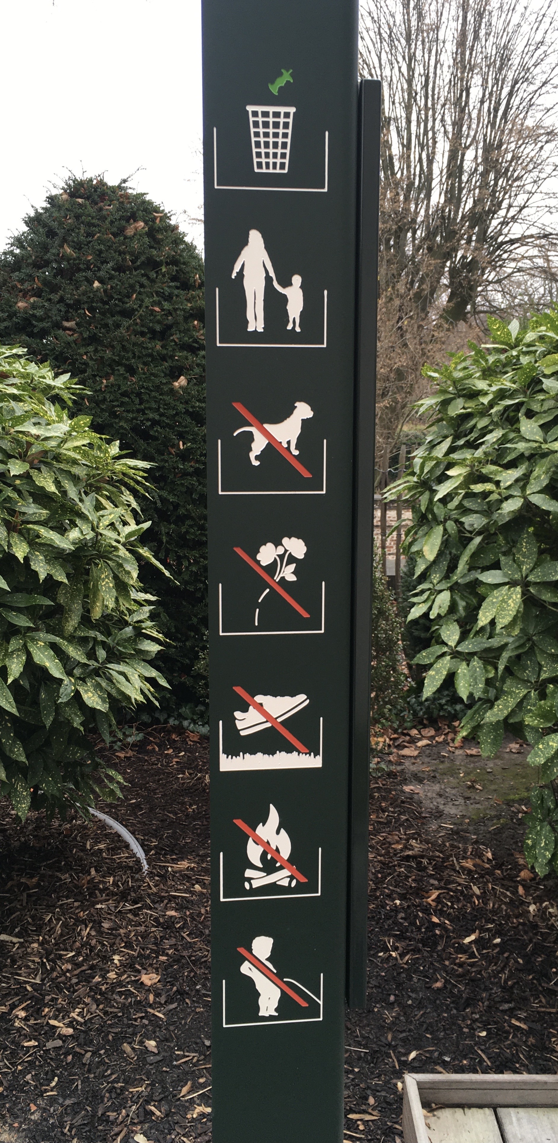 Français : Panneau d'interdictions dans le Jardin des Citoyens attenant le musée Wiertz (Bruxelles) |