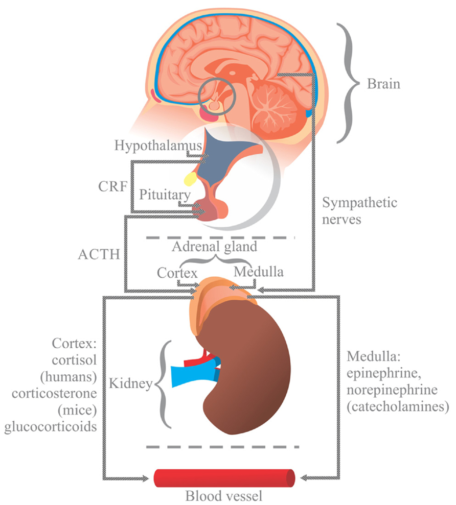 English: In response to stress, the hypothalamus (H) releases the corticotrophin releasing factor (CRF) into the anterior pituitary (P), causing the release of adrenocorticotropic hormone (ACTH) into the blood flow. ACTH stimulates the generation of glucocorticoids (cortisol in humans and corticosterone in mice) in the cortex of the adrenal gland (A), which are then released into the blood. Stress also activates the autonomic sympathetic nerves in the medulla of the adrenal gland to elicit the production of catecholamines, norepinephrine and epinephrine, which are then released into the blood. Glucocorticoids and catecholamines influence the generation of interleukins, which are involved in the viability and proliferation of immunocompetent gut cells via receptors. |