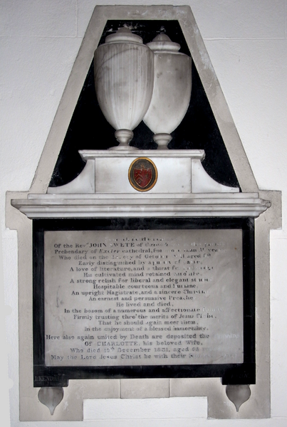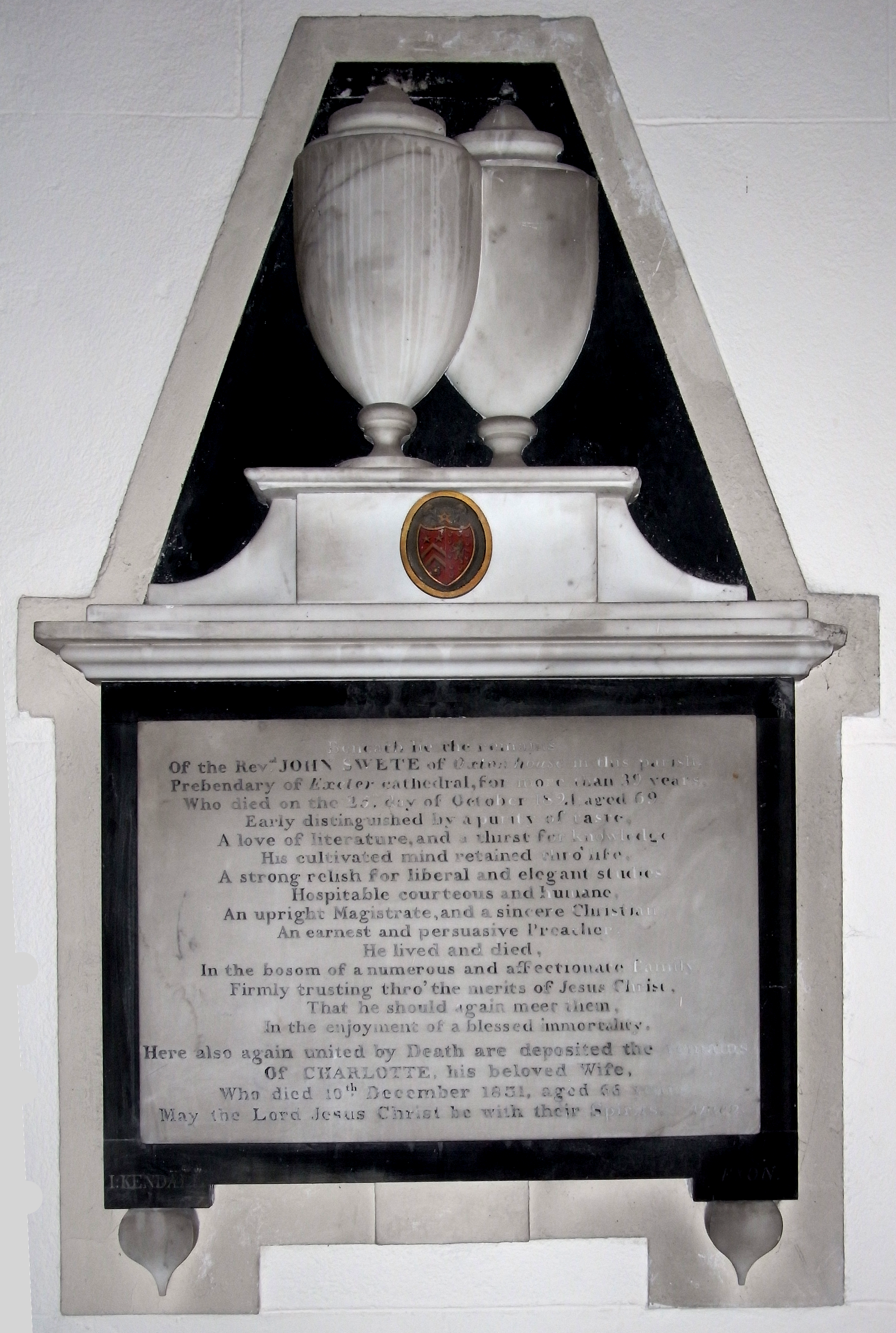 "Beneath lie the remains of the Rev'nd John Swete of Oxton House in this parish, Prebendary of Exeter Cathedral for more than 39 years, who died on the 25th day of October 1821 aged 69. Early distinguished by a purity of taste, a love of literature, and a thirst for knowledge, his cultivated mind retained thro' life a strong relish for liberal and elegant studies. Hospitable, courteous and humane, an upright magistrate and a sincere Christian, an earnest and persuasive preacher. He lived and died in the bosom of a numerous and affectionate family, firmly trusting thro' the merits of Jesus Christ that he should again meet them in the enjoyment of a blessed immortality. Here also again united by Death are deposited the remains of Charlotte his beloved wife who died 10th December 1831 aged 66 years. May the Lord Jesus Christ be with their Spirits. Amen".