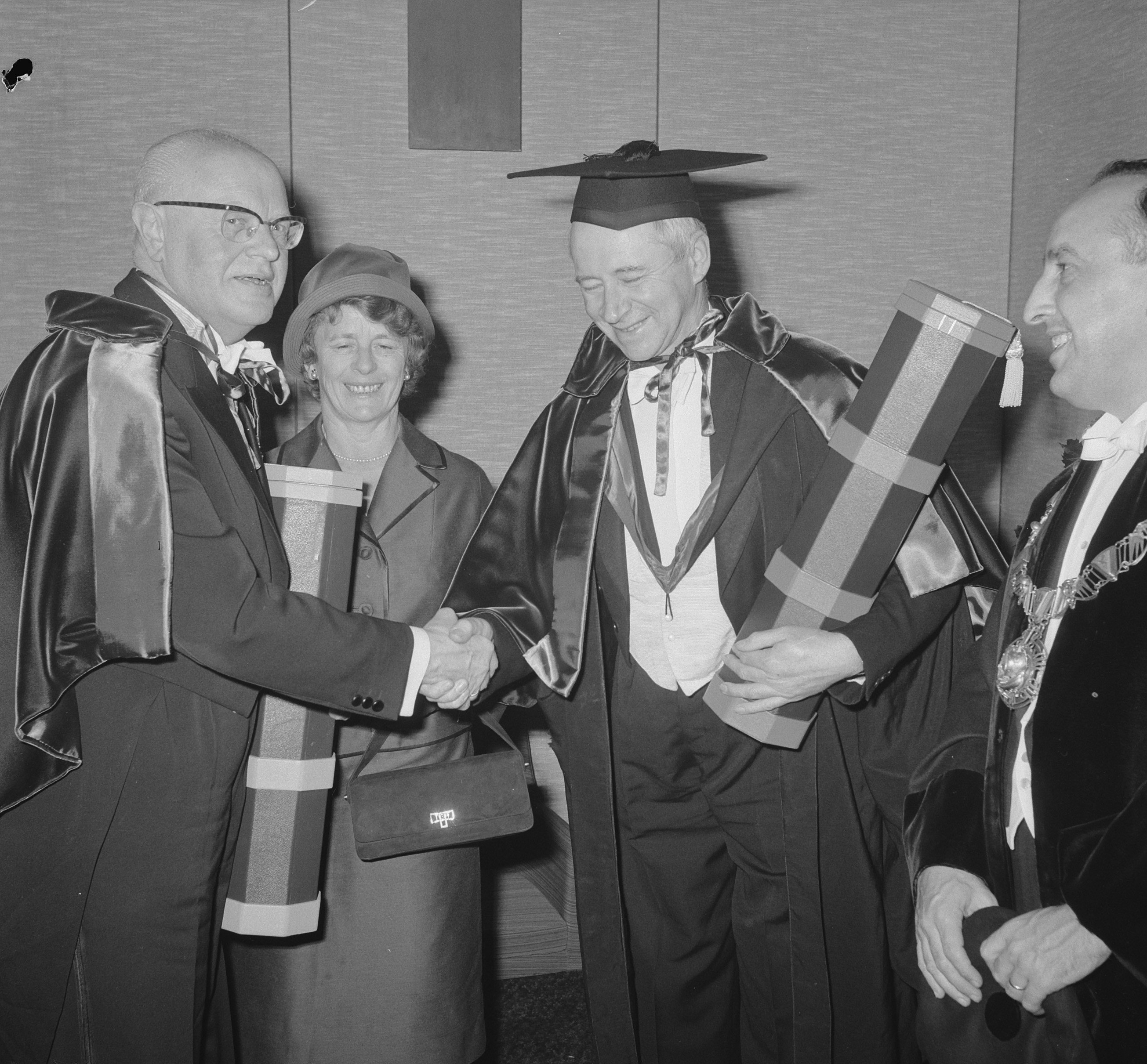 English: Carl Romme (left) and Colin Clark (eyes closed) receive honorary doctorates at Katholieke Hogeschool Tilburg, 1962. On the right: most probably Tilburg rector Frans van Dooren. Clark's wife Marjorie is standing between Clark and Romme (Dutch) |
