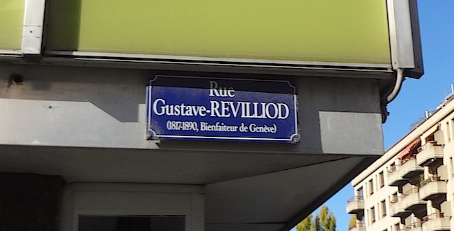 Français : Plaque de la rue Gustave-Revilliod, aux Acacias (Genève). |