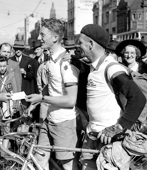| Description | Cyclists Hubert Opperman and Russell Mockridge arrive in Sydney from Melbourne on their Malvern Star bicycles on 13 June 1948 |