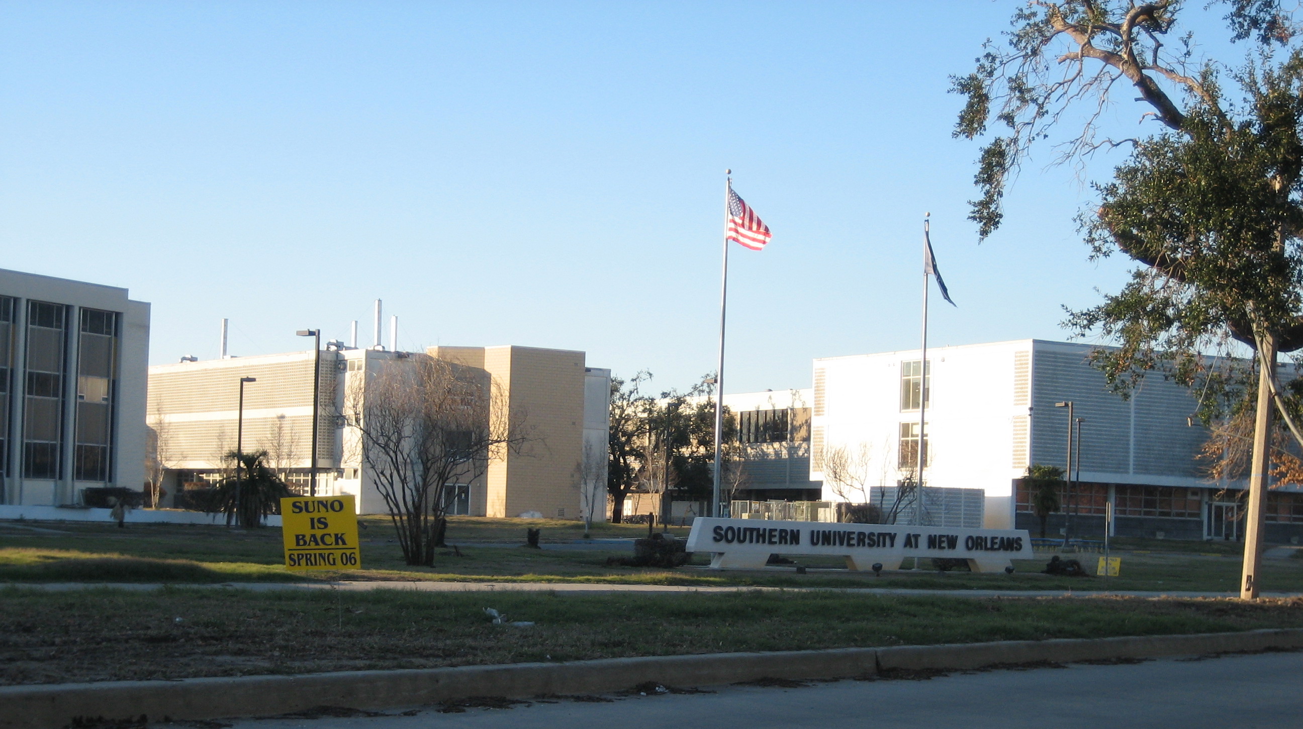 New Orleans after Hurricane Katrina: Southern University at New Orleans in the Upper 9th Ward flooded, but plans to reopen. Photo by Infrogmation 20 December 2005. |